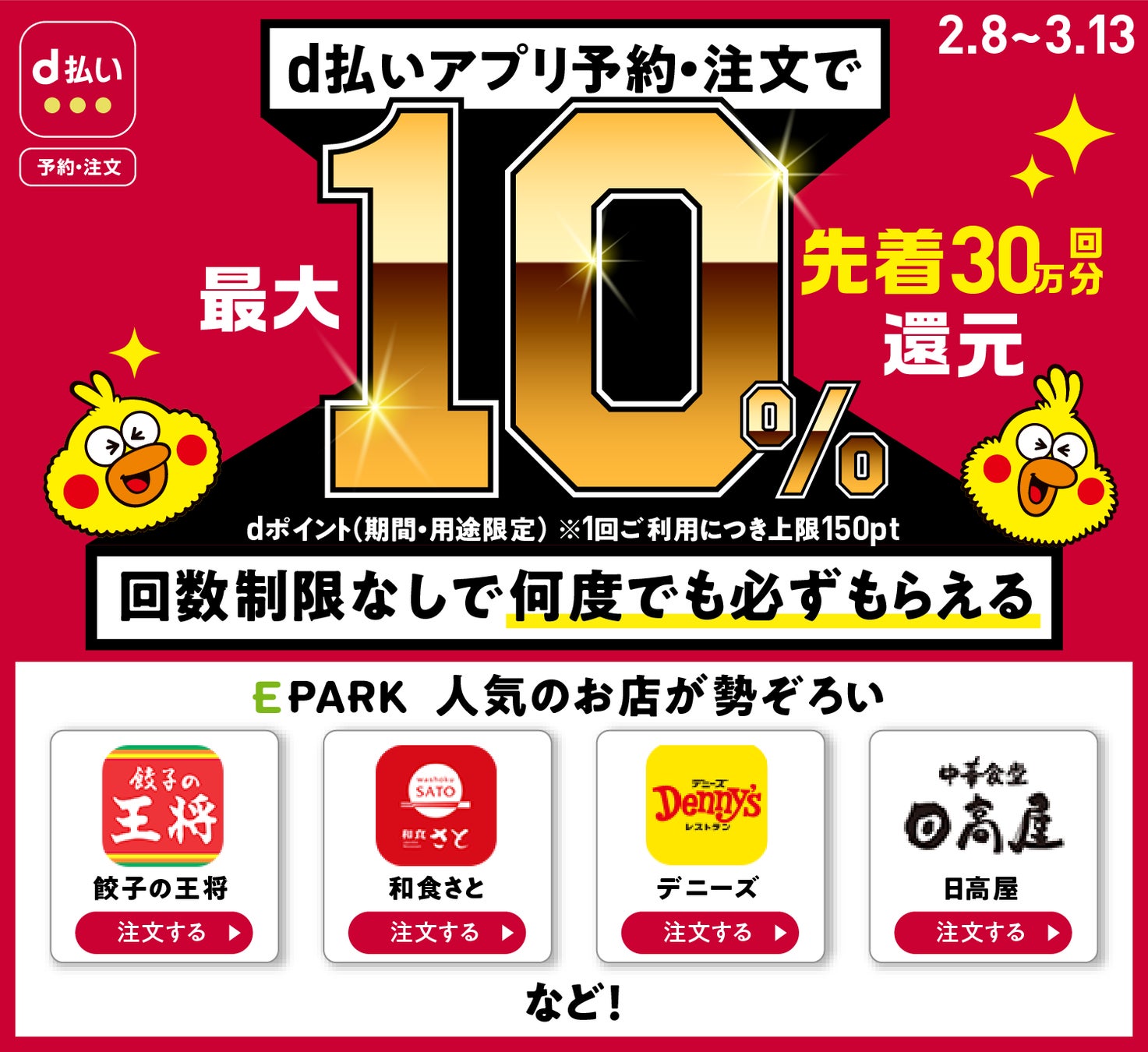 EPARKテイクアウトのd払い(予約・注文)ご利用で、先着30万回最大10%ポイント還元キャンペーン