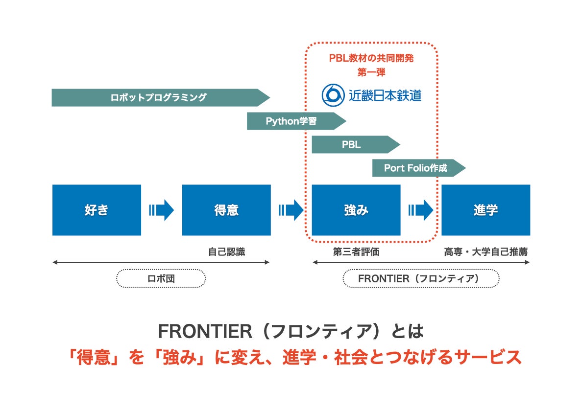 ロボットプログラミング教室「ロボ団」を運営するエディオングループの夢見る株式会社(大阪府堺市、代表取締役:重見彰則)は、近畿日本鉄道株式会社(大阪府大阪市、代表取締役社長:原恭)とのコラボレーションにて新事業「FRONTIER(フロンティア)」における小中学生向けPBL(課題解決型学習)のオンライン教材の共同開発を行ないます。