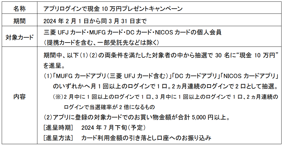 三菱UFJニコスは2月1日から3月31日まで、「三菱UFJカード」「MUFGカード」「DCカード」「NICOSカード」の個人会員向け(一部を除く)に、各カードのスマートフォンアプリ(※)へのログインと対象カードでの期間中合計5,000円以上のお買い物で“現金10万円”が抽選で30名に当たるキャンペーンを実施します。