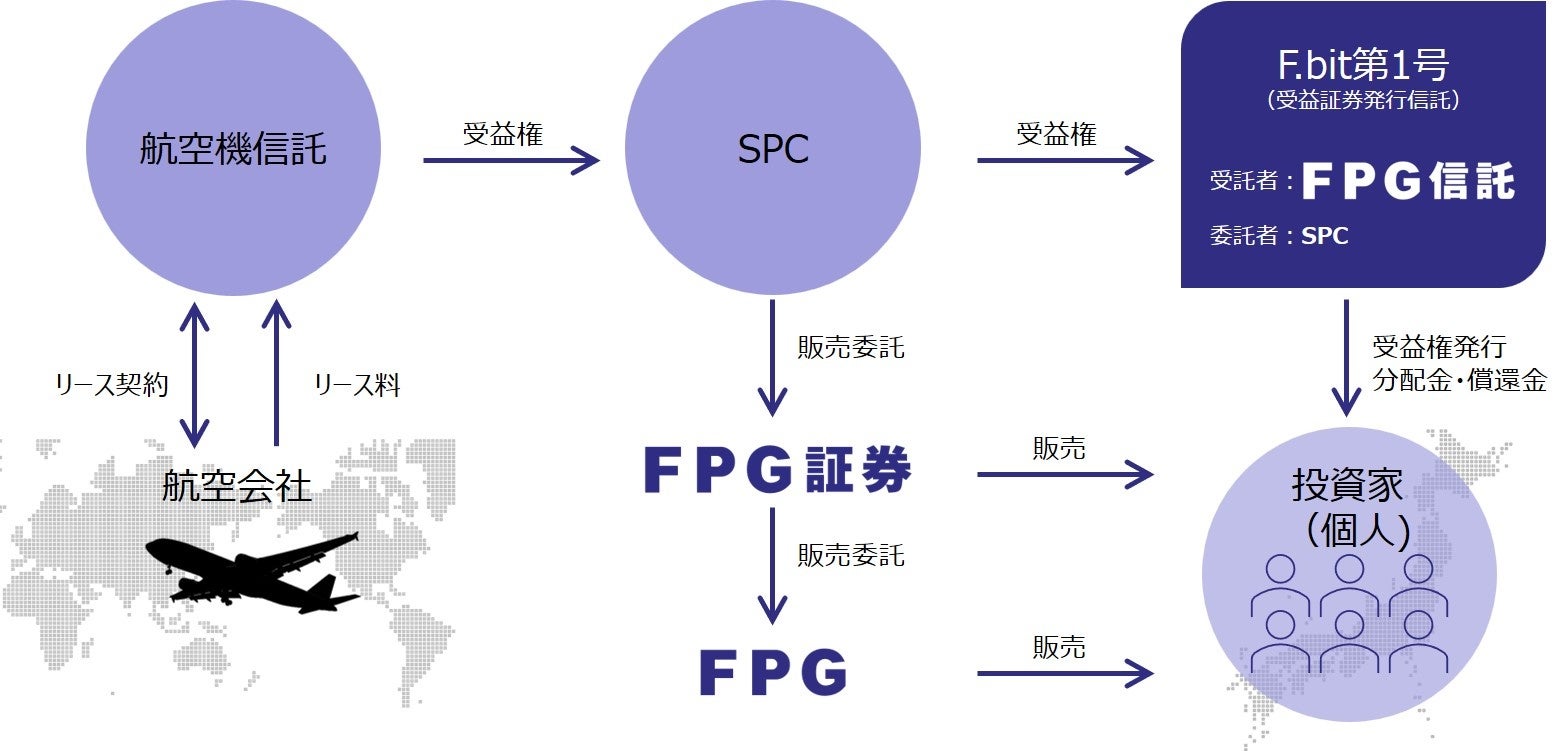 当社の完全子会社である株式会社FPG証券(以下、「FPG証券」)にて、国内初※1となる公募型の受益証券発行信託による個人投資家向け航空機小口化商品「F.bit航空機小口化商品第1号(譲渡制限付き・為替ヘッジなし)」(以下、「F.bit第1号」)の取扱いを開始しました。今後、当社が手掛ける受益証券発行信託による個人投資家向け小口化商品は、「F.bit(エフビット)」という商品ブランドで展開してまいりますので、併せてお知らせいたします。