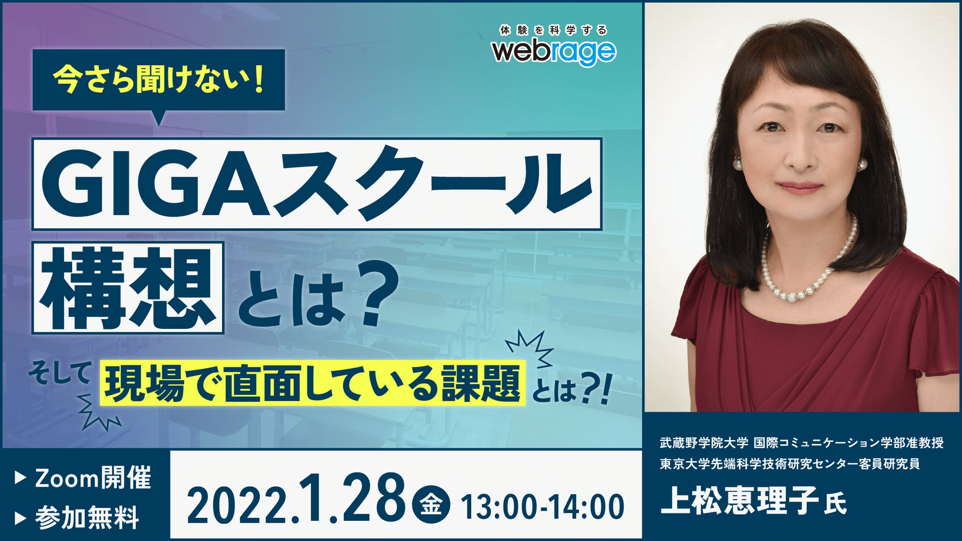 当ウェビナーではICT教育研究家の上松恵理子 博士(教育学)をお招きし、GIGAスクール構想とは何か、そして学校現場でいま直面している課題と、成功事例等についてお話いただきます。ICT教育に関わりのある方はもちろん、GIGAスクール構想についてよくわからない、という方にも学んでいただける内容です。