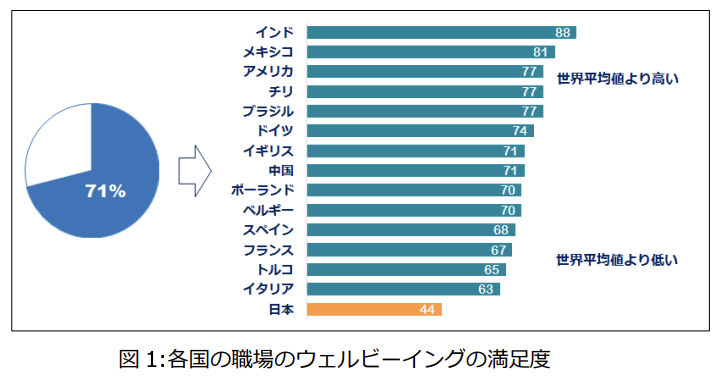 バークレーヴァウチャーズ株式会社による、世界における職場でのウェルビーイングに関する「2016年度Edenred-Ipsos Barometer調査」によると、日本人の内「ウェルビーイングに満足している」と回答した割合は44%にすぎず、調査対象となった15カ国の中で、最下位の数値となりました。また、「毎朝職場に通うのが楽しみである」と回答した回答者は30%しかいませんでした。