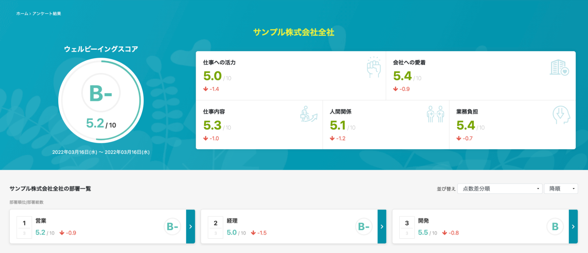 1、組織のメンタルのコンディション(幸福度)がひと目でわかります。