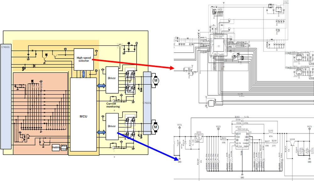 ECU(現物)から、搭載部品を取り外して部品調査を実施して、プリント基板の平面研磨を行い、配線トレースを実施し、等価回路図や機能ブロック図を、作成します。