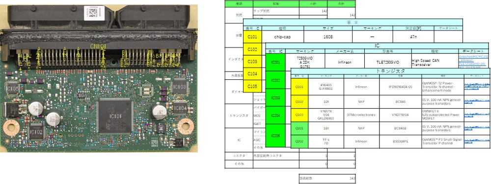 ECUに搭載されている各部品を、EXCELシートに素子毎に分類、ナンバリングを行います。