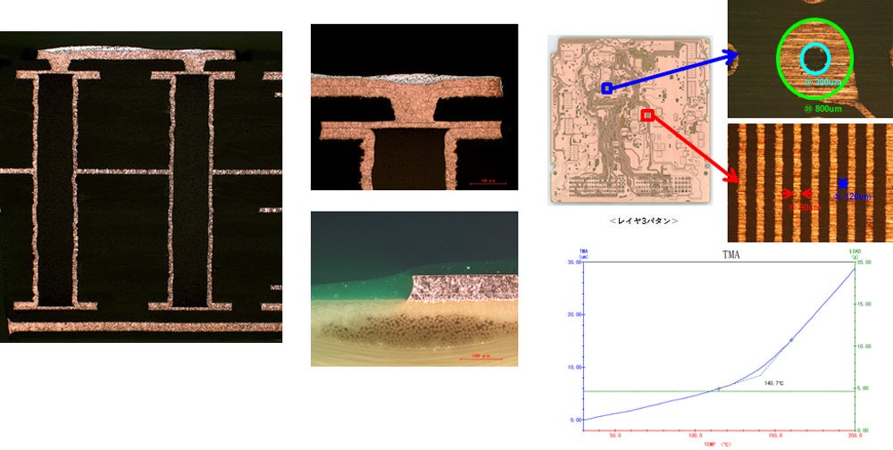 プリント基板の断面、平面パタンの測⾧やガラス転移温度(Tg)測定など、各種構造解析・材料分析に対応します。