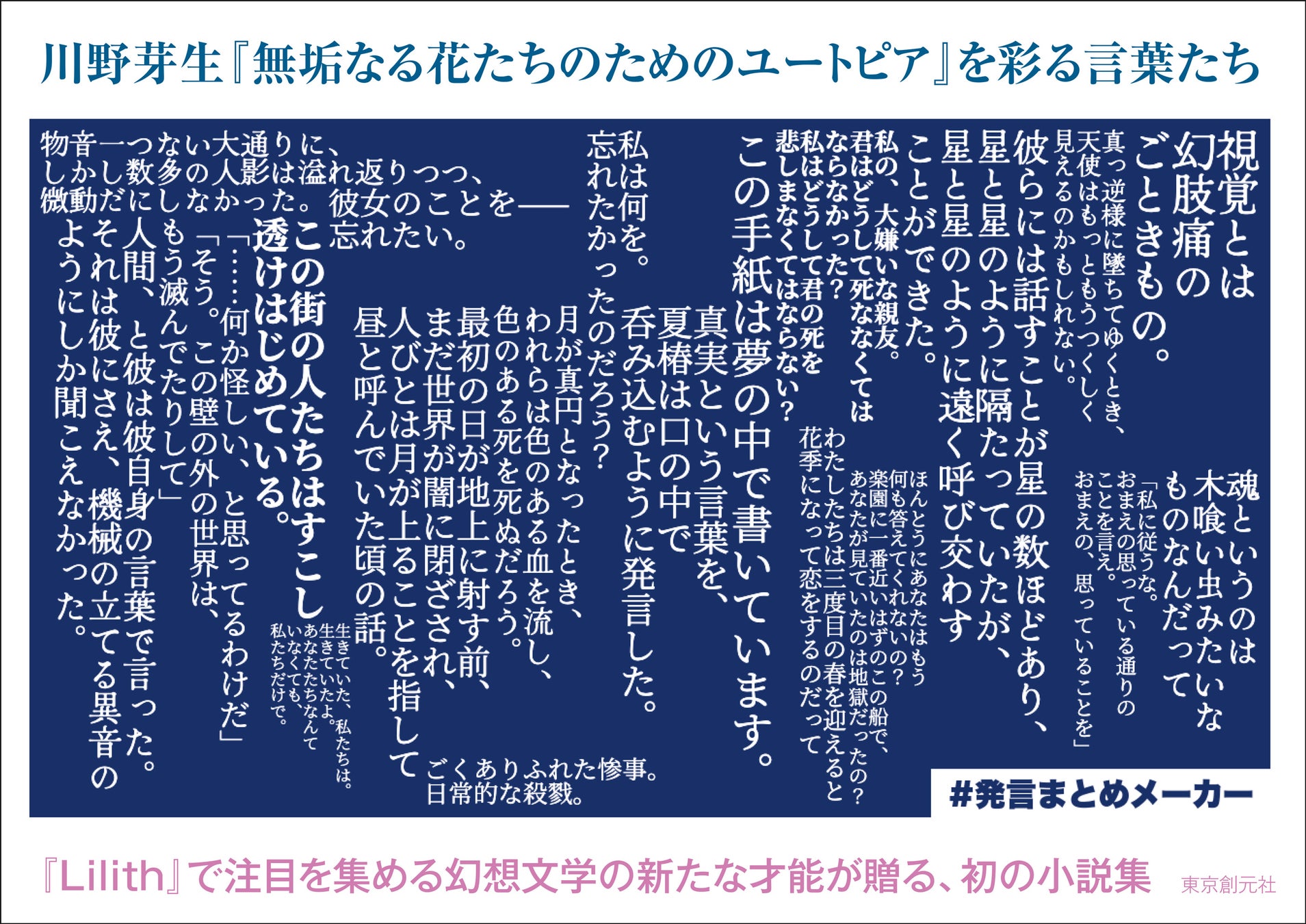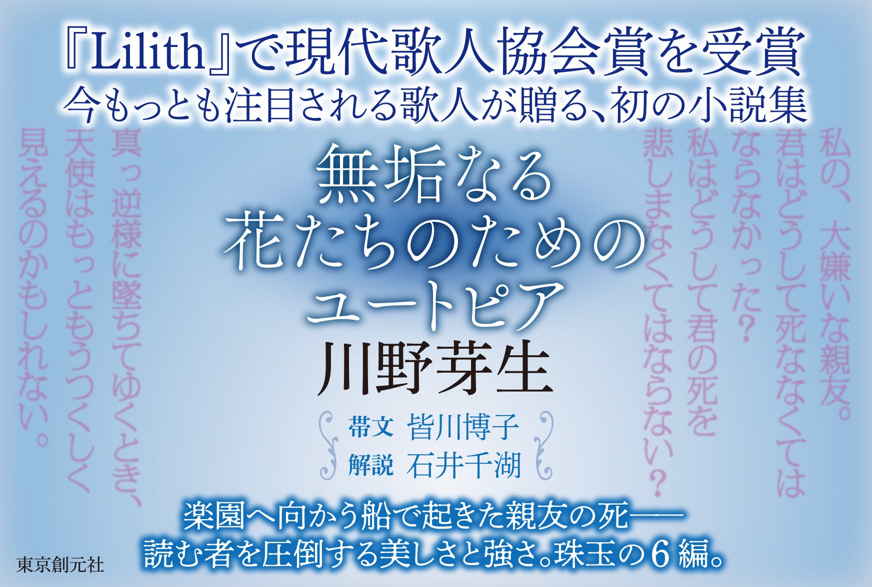 第一歌集『Lilith』の刊行時は、栞文に水原紫苑氏、石川美南氏、佐藤弓生氏、帯文には山尾悠子氏という錚々たる書き手から言葉を寄せられており、著者への期待の高さが窺われます。そして初の小説集となる今作でも、高い注目を集めることは間違いありません。川野芽生『無垢なる花たちのためのユートピア』にぜひご期待ください!