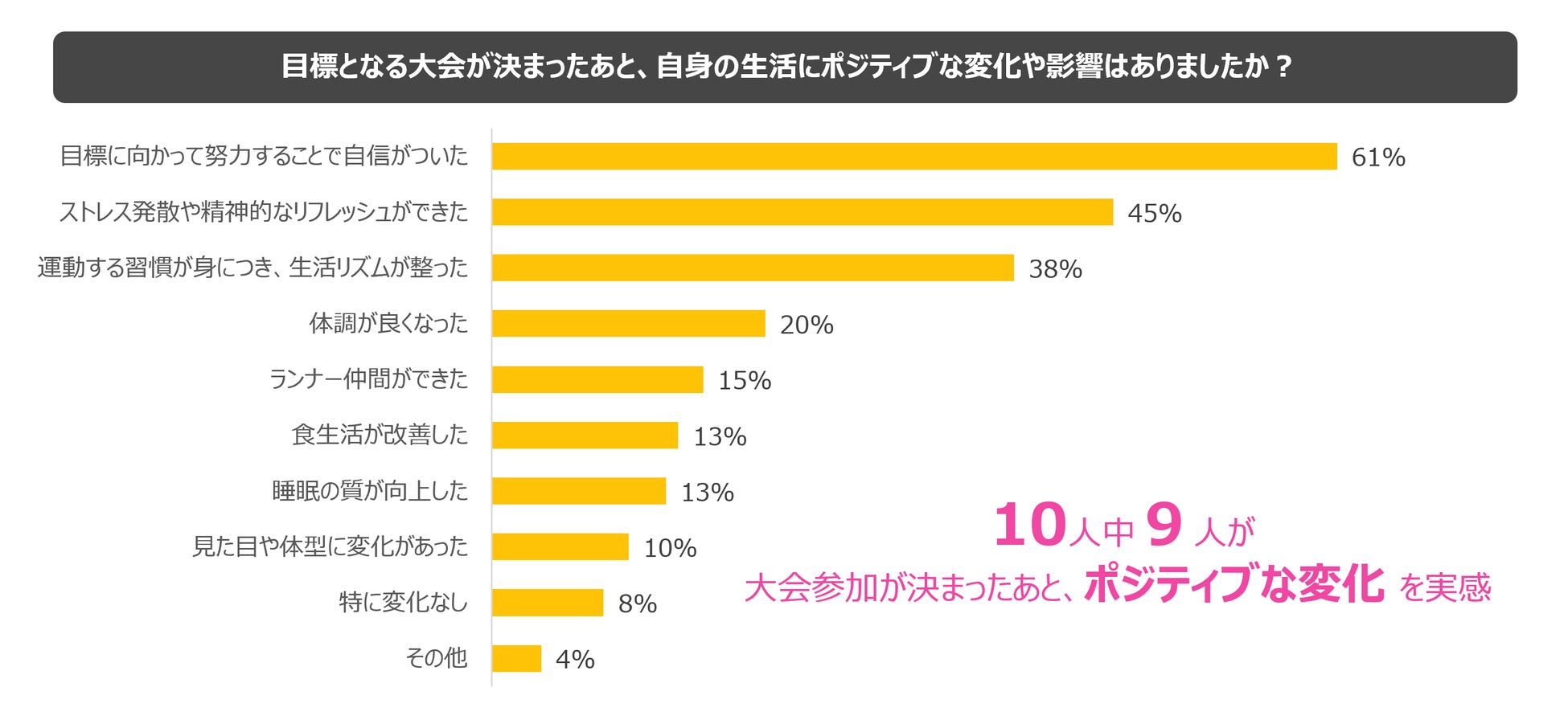 10人中9人が、エントリーから大会当日までの準備期間でポジティブな変化を実感。大会に向けてランニングを習慣づける過程で、精神的な面でも大きなメリットがあることが明らかになりました。