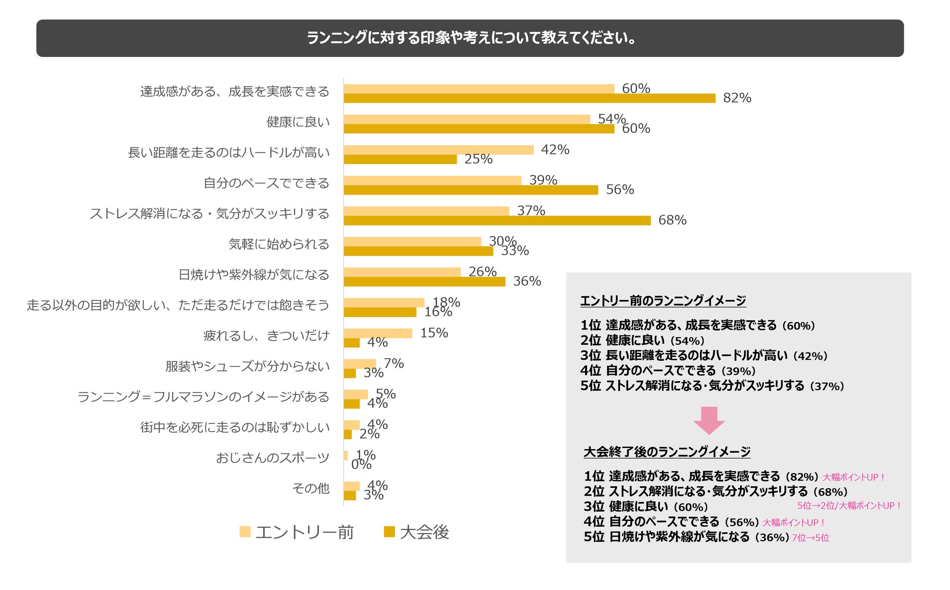 ・エントリー前と大会後で、ランニングに対する印象が大きく変化。大会参加を経験したことでランニングへのポジティブなイメージが大きく向上(特に精神的なメリットを実感)