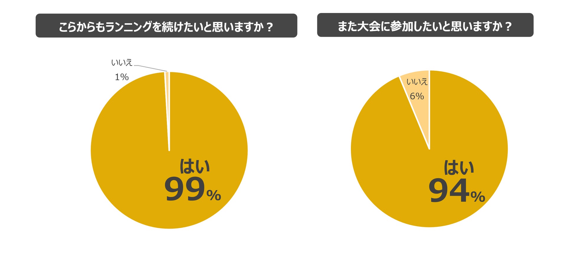 ・99%がこれからもランニングを続けたい、94%がまた大会に参加したいと回答