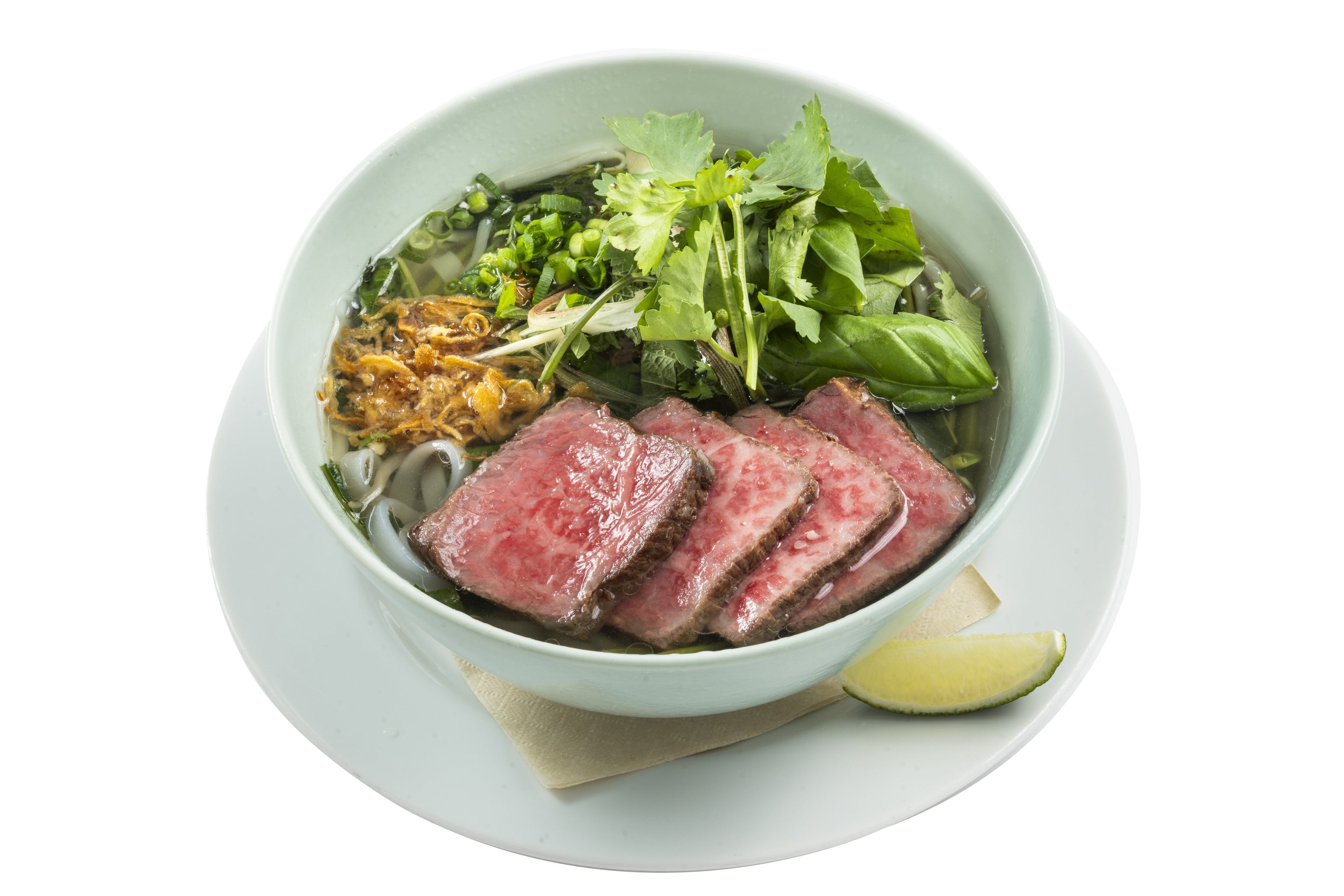 牛ダシが染みるスープに、厚めにカットした牛肉をのせたボリューム満点のフォー。パクチー・バジル・シソなどたっぷりの薬味を絡めてどうぞ。