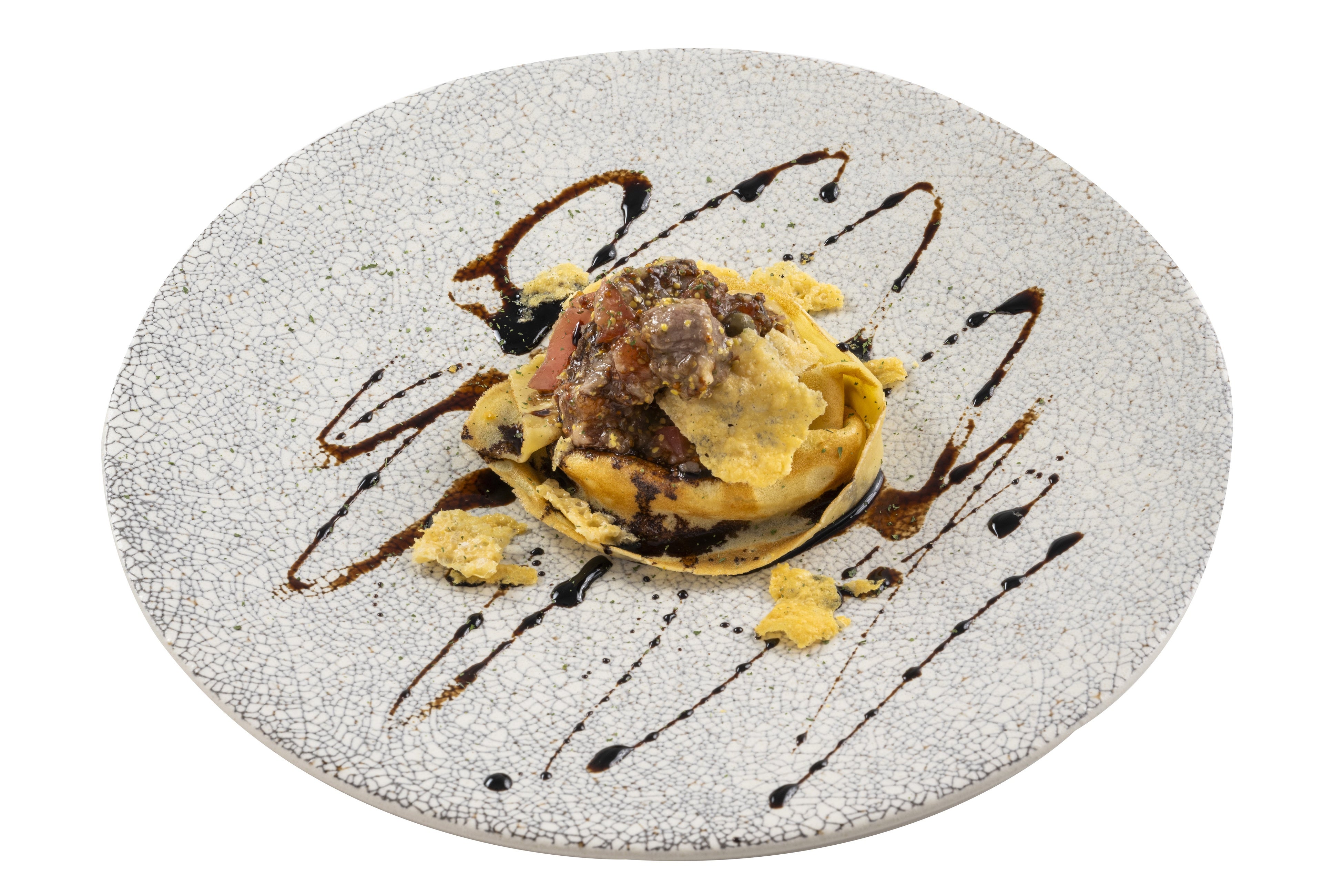 トマトや粒マスタード・ケッパーを使ったソースと牛肉を和えた絶品マリネ。クレープで作った器を崩しながら召し上がれ♪