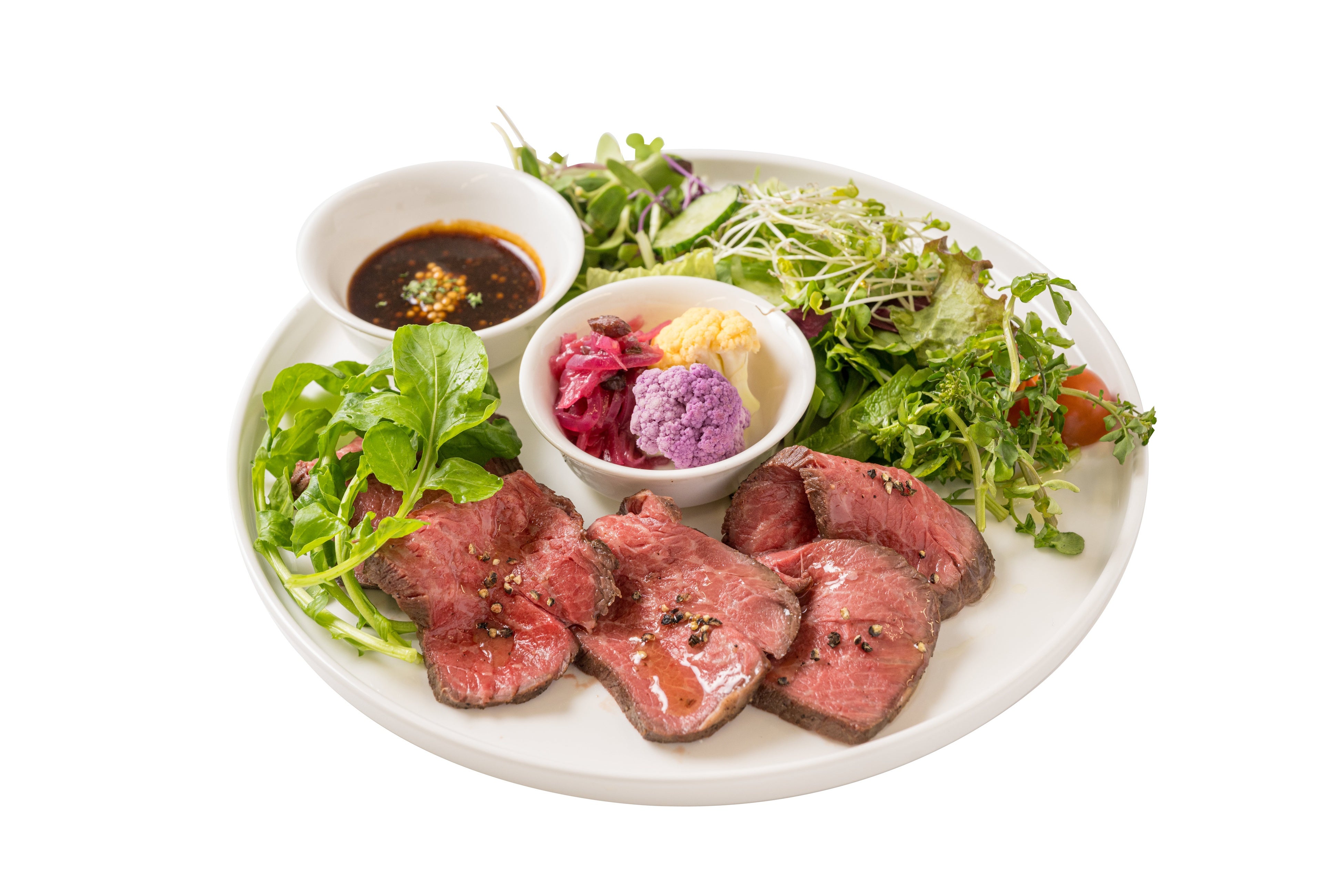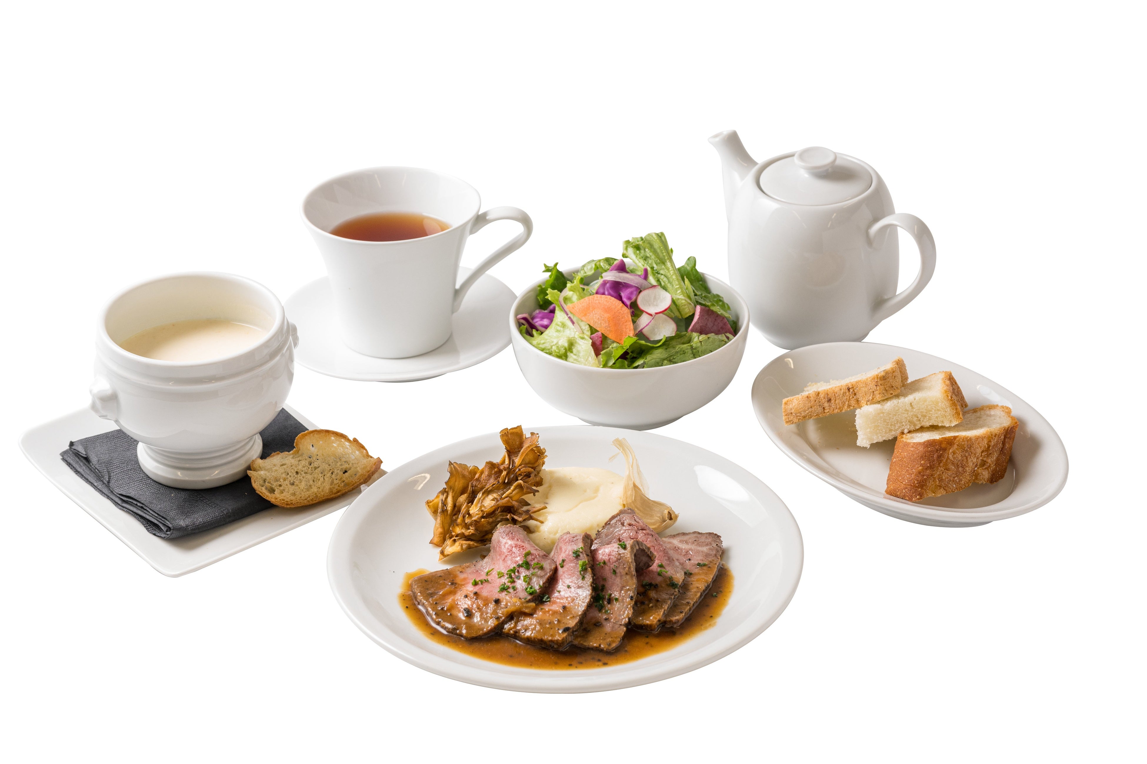 赤身の甘みが楽しめるローストビーフが、トリュフソースでよりリッチな味わいに。スープ・サラダなども付いたお腹も心も大満足のセット。