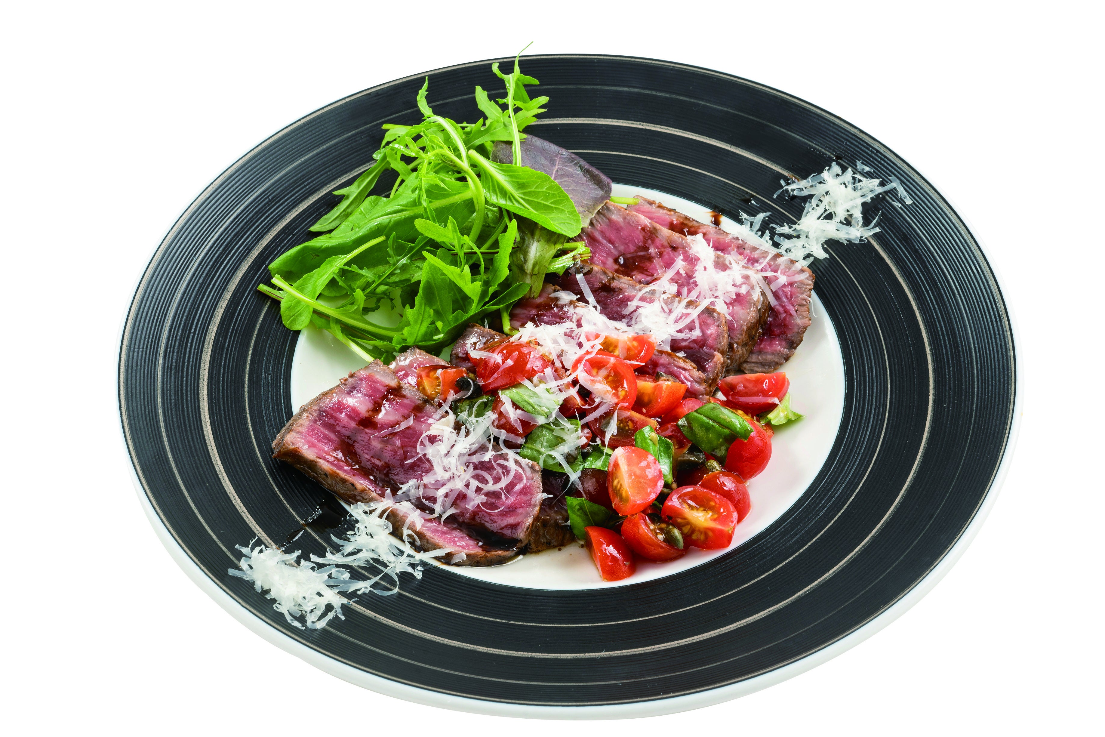 絶妙な火入れ加減の牛肉に、トマト・バジル・ケッパーを合わせた冷たい“ケッカソース”を添えて。バルサミコ風味が夏にぴったり!