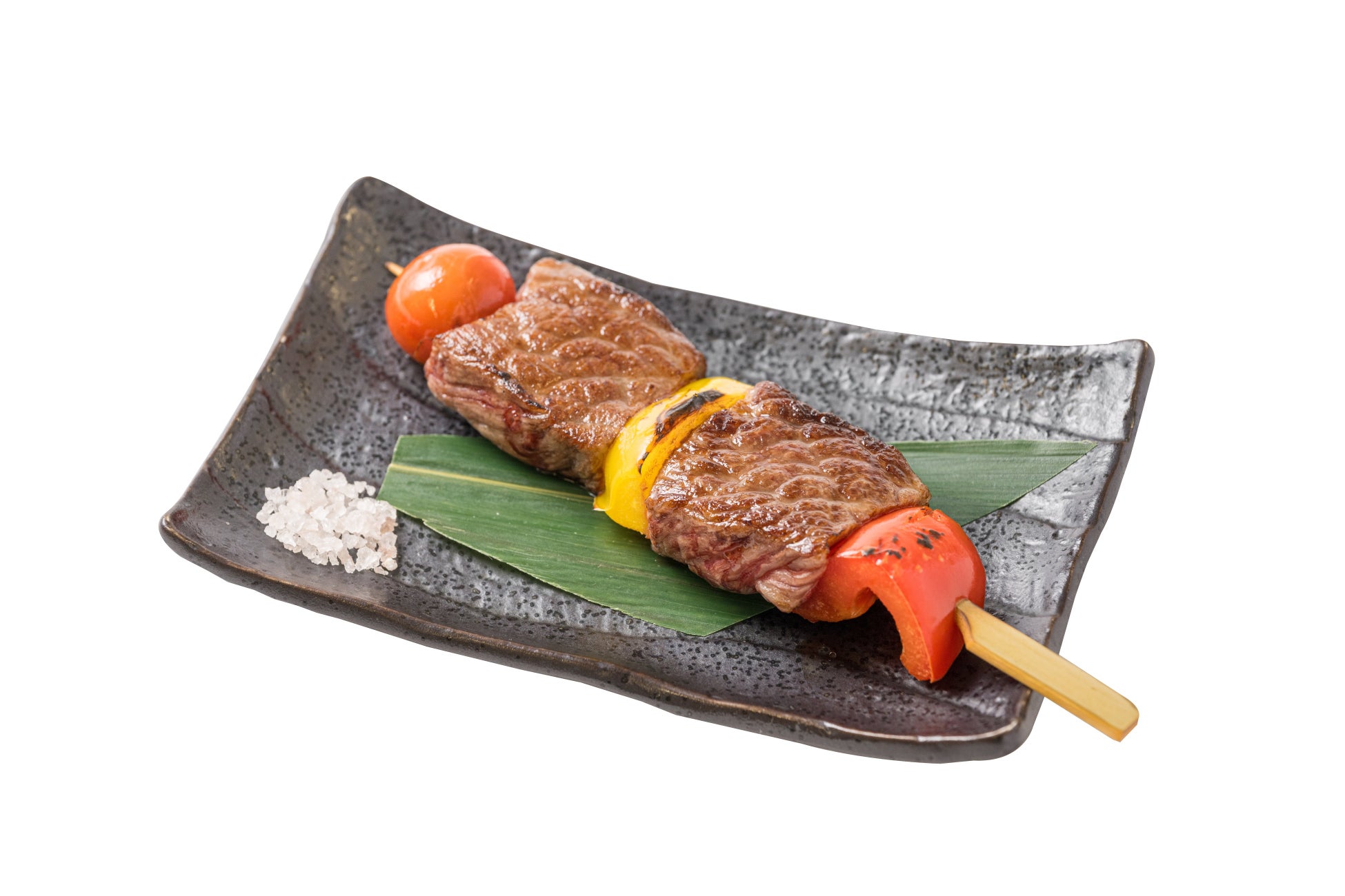 彩り豊かな野菜を合わせた季節感あふれる牛串。パプリカの食感、トマトの酸味が牛肉を上品にサポートしています。