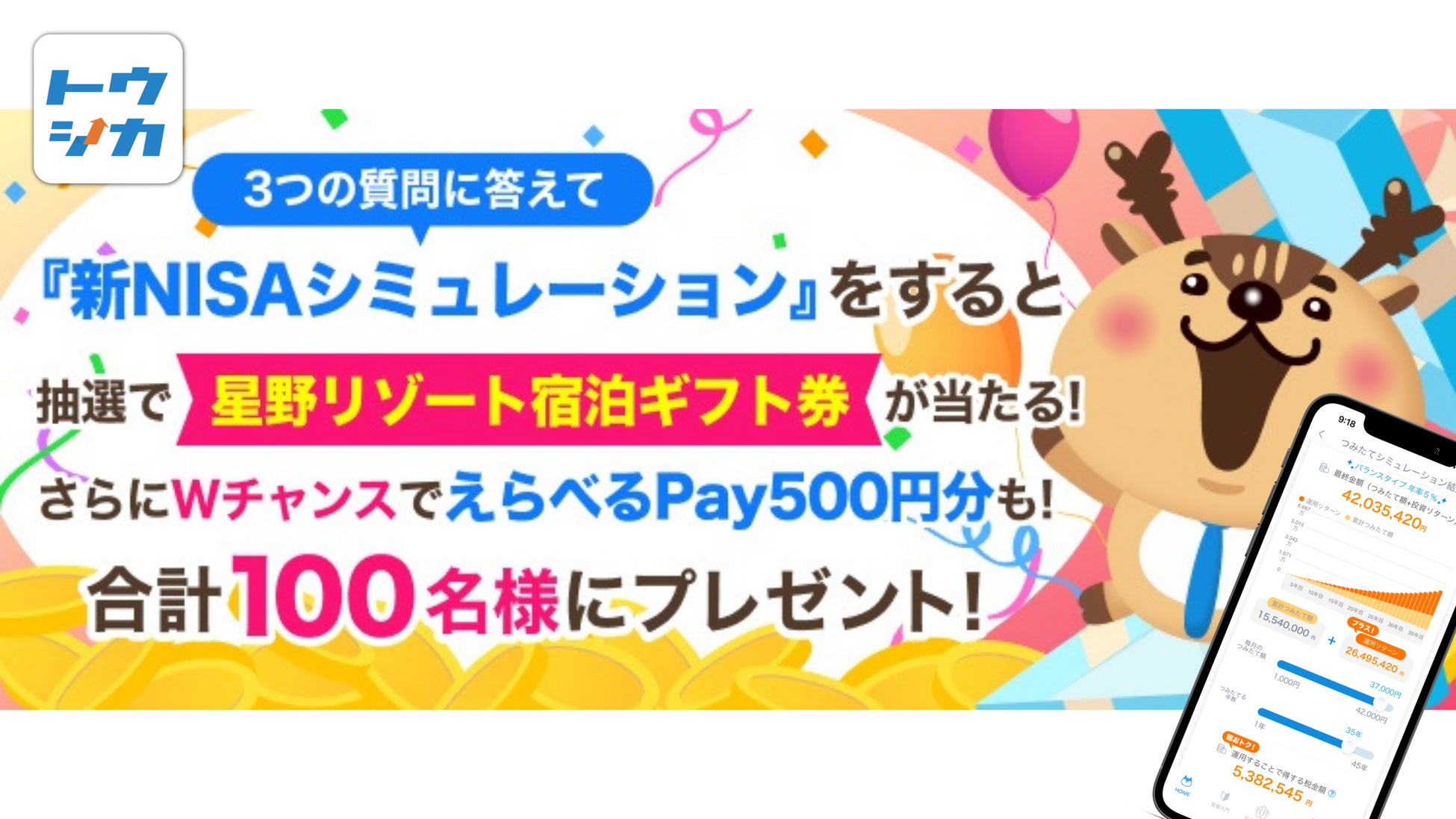 「トウシカ」の「新NISAつみたてシミュレーション」でシミュ―レーションを行い、本キャンペーンに応募された方の中から、抽選で100名様にギフトをプレゼントいたします。