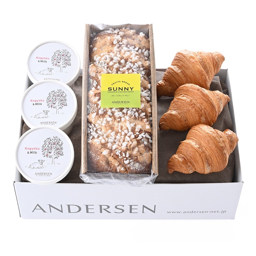 サゴタニ牧農の新鮮な生乳とアンデルセンファームのりんごを使ったジェラートに、フルーツブレッド、ミニクロワッサンをセットにしました。