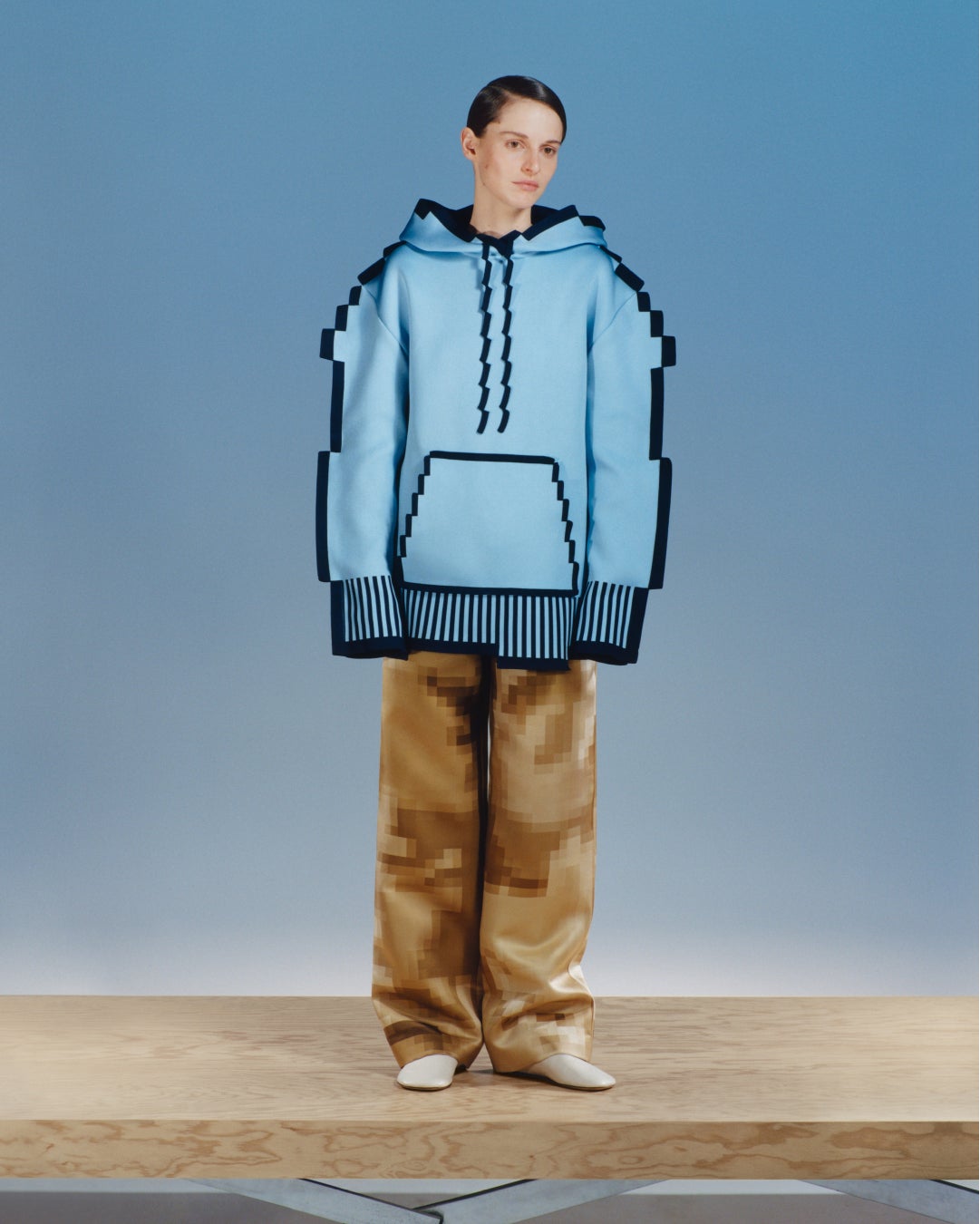 現実に発生した「バグ」。SS23のピクセル化したウェアやバッグは、デジタルイメージが現実に表出したかのような錯覚を作り出します。