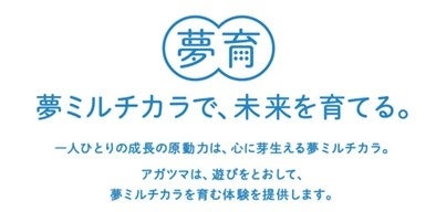 株式会社「アガツマ」は、“夢ミルチカラで、未来を育てる。”をテーマとした「夢育」を新たな企業理念として掲げています。遊びをとおして、「安心のために」、「みんなのために」、「地域のために」、3つの「夢育」アクションをはじめています。