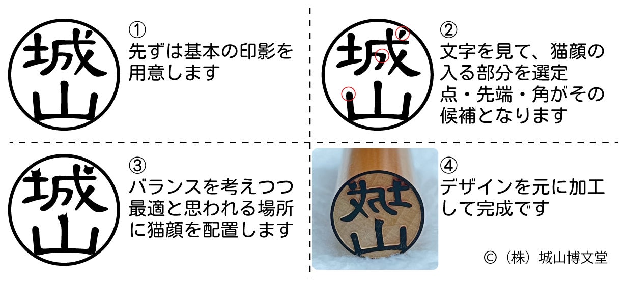 一般的な印鑑の形を元に、名前の一部(トメ・ハネ・角など)を猫の顔にデザイン。