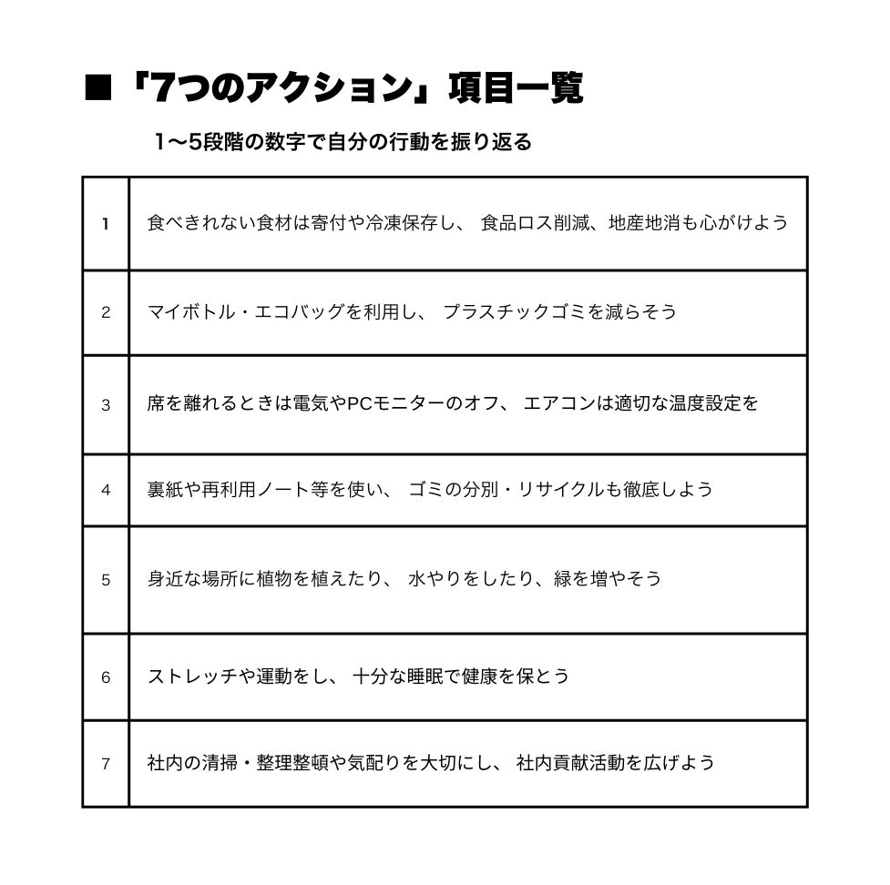 社内では、SDGsを日常の行動に取り入れるための指針として、「7つのアクション」を設定しています。