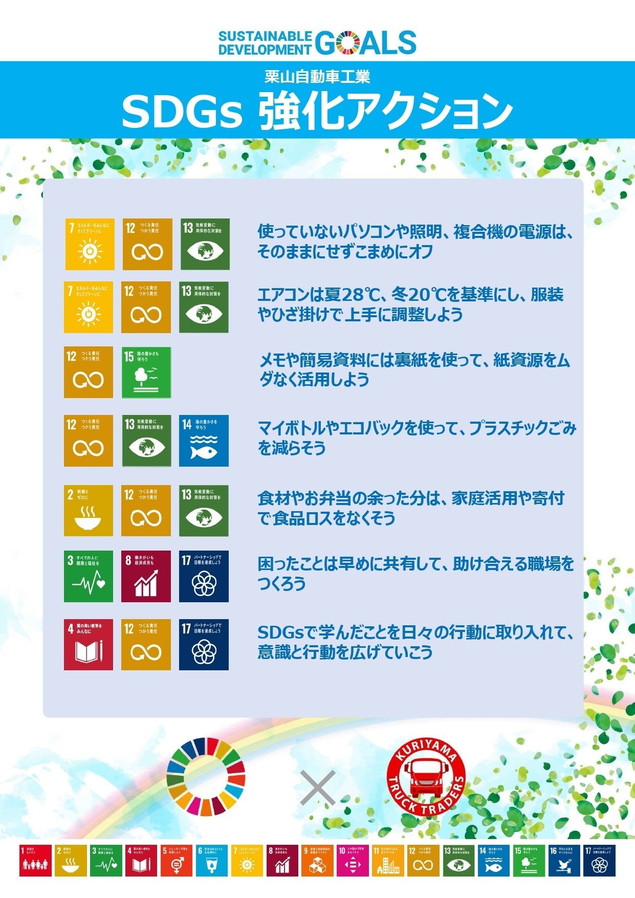 栗山自動車工業では、特別な取り組みだけでなく、日常の小さな行動の積み重ねがSDGsにつながると考えています。