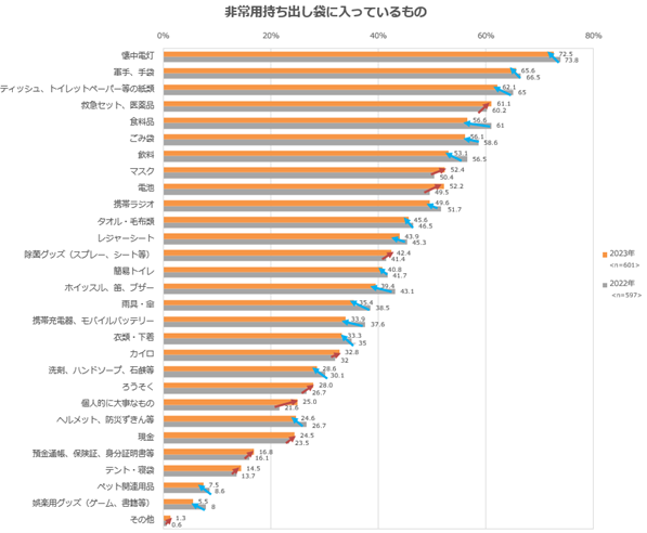 「非常用持ち出し袋」にいれているモノのアンケートでは、現金や電池、カイロといった身近で揃えられるものは微増している反面、防災ずきんや簡易トイレといった揃えるのに手間がかかるものは微減という結果に。
