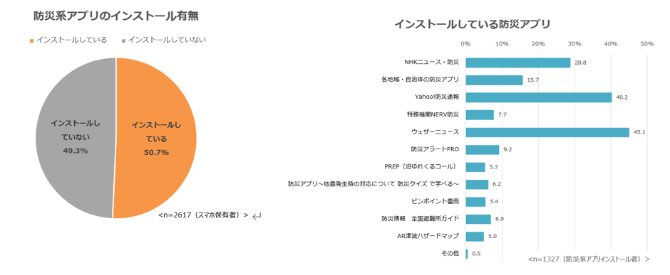 防災アプリに関しては、実際にアプリをインストールしている人は50.7%と、約半分。インストールしているのは、「ウェザーニュース」と「Yahoo!防災速報」「NHKニュース・防災」の3種類が群を抜いて多い結果となり、やはり大手サービスゆえの信頼感が支持される要因と思われます。