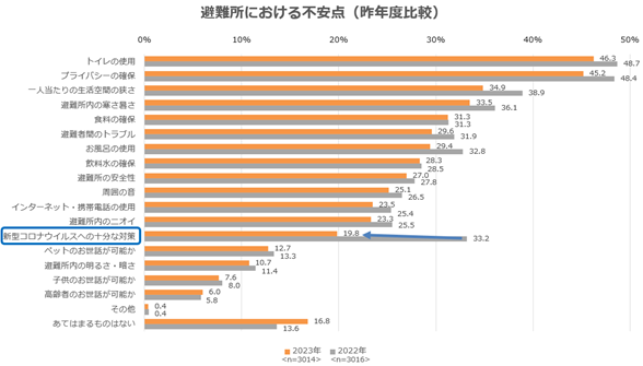 避難所における不安点に関しても、全体的に微減の傾向がみえるなか「新型コロナウイルスへの十分な対策」に対しては、昨年の33.2%から19.8%へと大幅に減少しています。施設に対して対策を求めるよりは、自分たちの予防意識で十分という考え方にシフトしているのかも知れません。