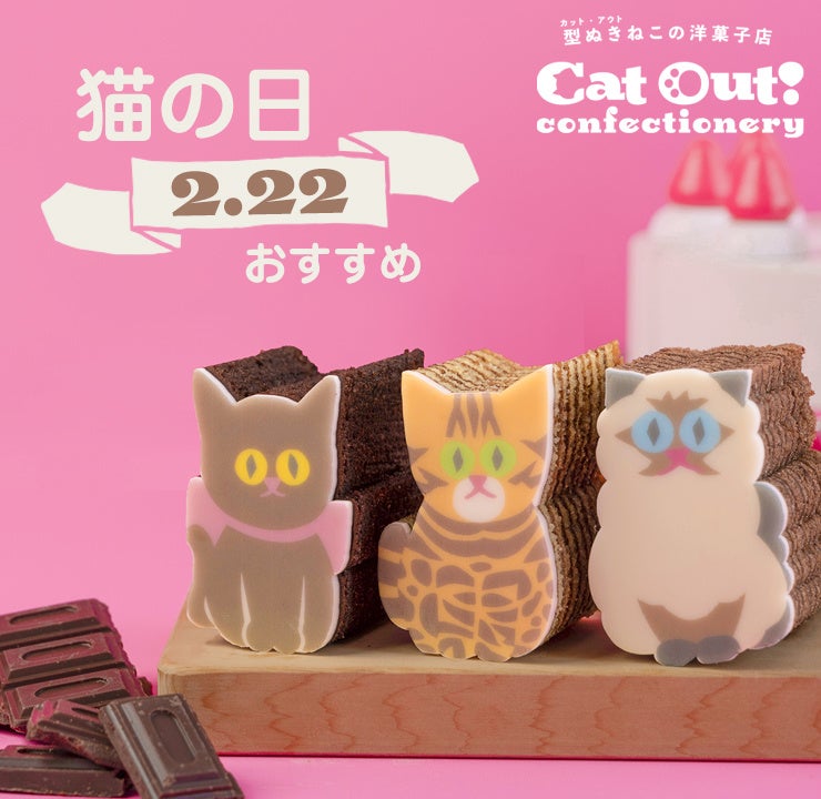 猫の日おすすめ商品「ショコラねこ ガトー・ショコラ」と「ヒマラヤン ココア・バウム」を販売中。2月15日からは新グッズ「Cat Out!巾着」も新登場!猫好きさんへのプレゼントにぜひご検討ください。