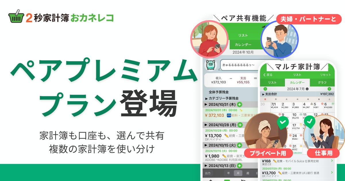 共働き世帯1,300万世帯時代、家計簿は“ひとりで抱えない時代”へ。家計簿アプリ「おカネレコ」が複数家計簿、共有機能追加する「ペアプレミアム」プランを提供開始