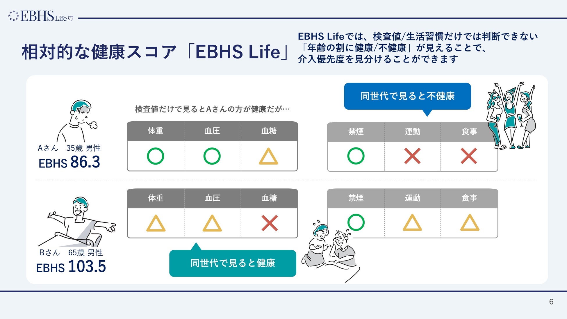 ブース内では、「EBHS Life(エビスライフ)」を体験いただけます。質問に答えるだけで、数万人分の健康関連データ、3,000件以上の論文レビューを基に、健診結果などから寿命を予測し、日本人平均との相対的な健康指標を算出。“自分が今どんな状態か”をメンタル・ボディ両面から総合的に評価することが可能です。