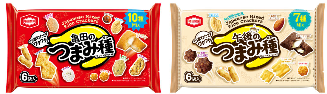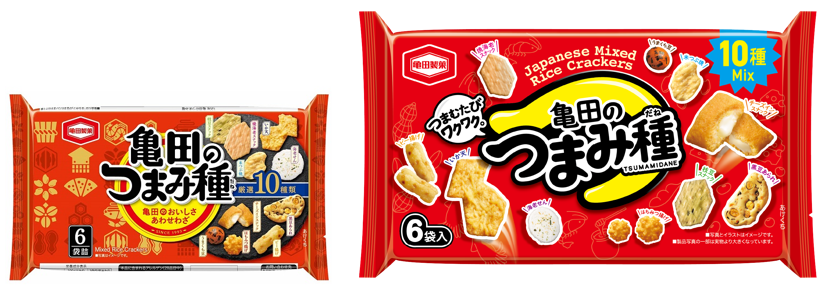 『亀田のつまみ種』の新テーマ「多種多彩、つまむたびワクワク。」の策定にあわせて、パッケージもリニューアルします。新パッケージでは、特徴的な赤ベースの印象はそのままに、つまむ時の指の形と「つ」を掛け合わせたブランドロゴや製品の配置などから「見て、迷って、選んで、食べて、楽しい」ワクワク感のあるカジュアルな印象に一新しました。 『左:旧パッケージ、右:新パッケージ』