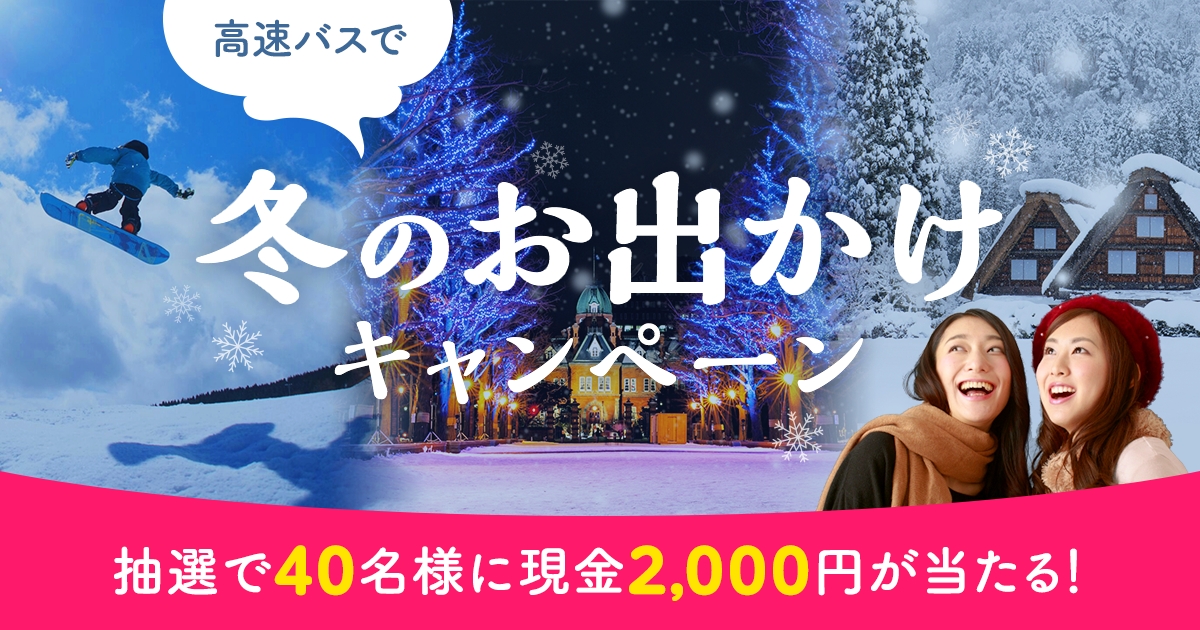 全国の高速バス・夜行バスの料金が比較できる「夜行バス比較なび」(https://www.bushikaku.net/)を運営する株式会社LCL(本社:東京都中央区、代表取締役:渡辺佳昭)は、高速バス・夜行バスを利用して冬のお出かけをする方を対象に抽選で40名様に現金2,000円をプレゼントする冬のお出かけキャンペーンを実施いたします。