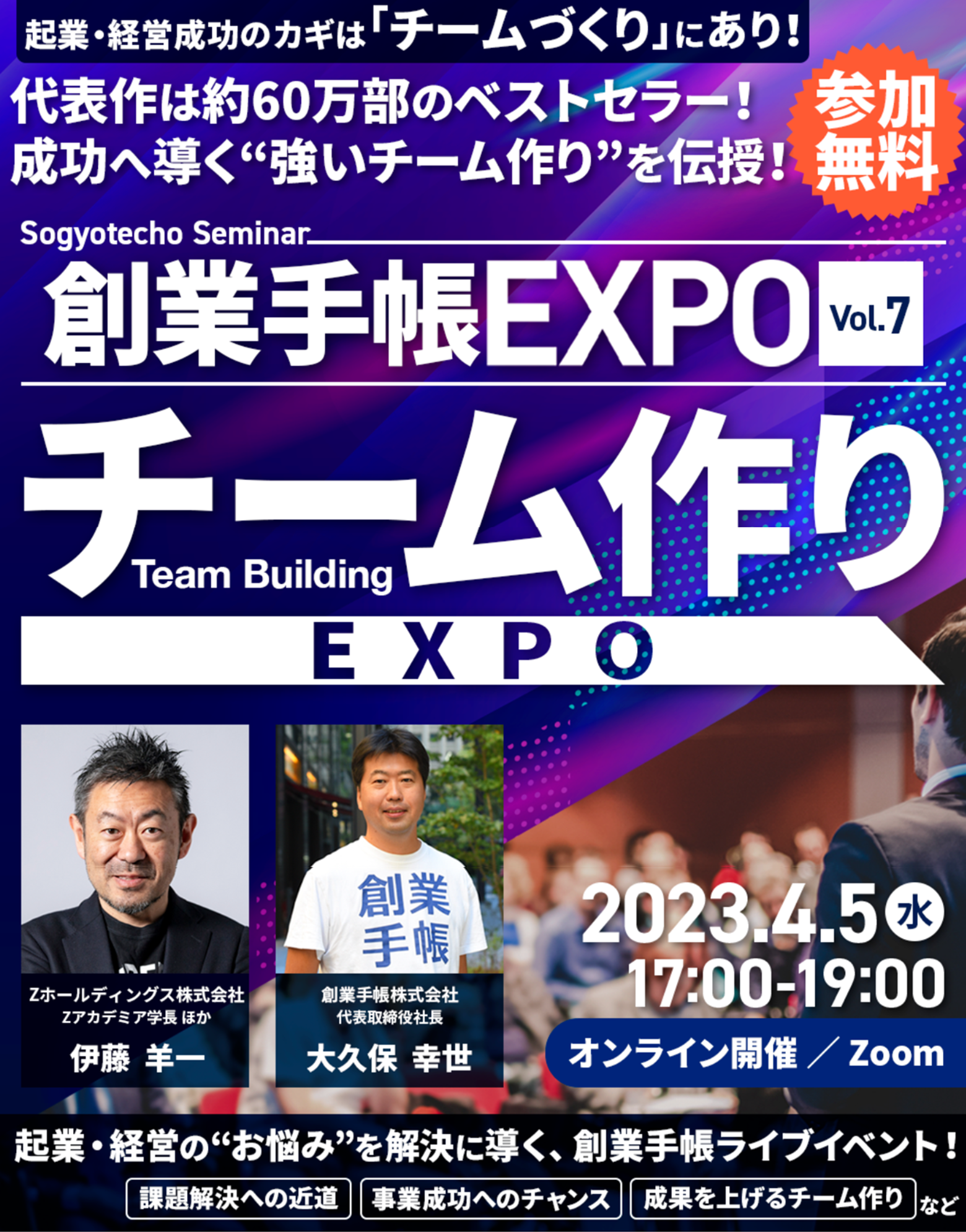 創業手帳株式会社(本社:東京都中央区京橋、代表:大久保幸世)は、このたび2023年4月5日(水)に「チーム作りEXPO」を開催します。