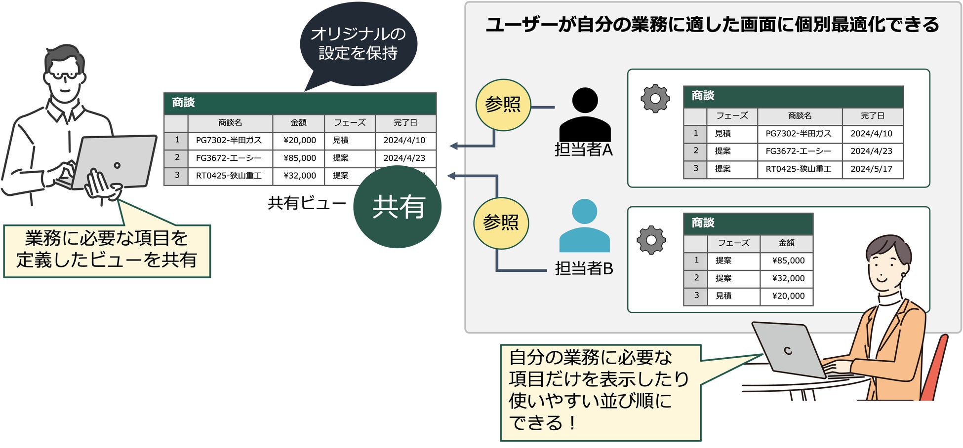 例えば、営業部門に複数の支社があるような場合、営業部門で使う項目をマスタービューで作成し、支社ごとに必要な項目はマスタービューを継承してカスタマイズすることで、それぞれの支社で使いやすいビューを実現できます。継承されたビューは、他のユーザーに共有が可能で、ユーザー自身が使いやすいように表示の調整も行えます。現場の担当者が使いやすい画面を手にすることでこれまで以上にSalesforceの定着と活用を期待できます。