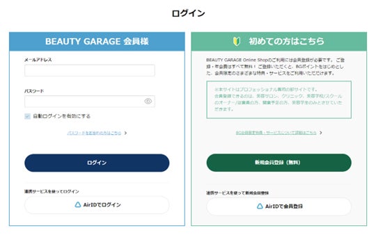 「Air ビジネスツールズ」のログインIDであるAirIDと「BEAUTY GARAGE Online Shop」のログインIDであるBEAUTY GARAGEアカウントをSSO連携することで、AirIDを用いて「BEAUTY GARAGE Online Shop」にログインし、サービスを利用できるようになりました。これにより、「Air ビジネスツールズ」と「BEAUTY GARAGE Online Shop」を併用する際、それぞれ異なるIDでのログインが不要になります。