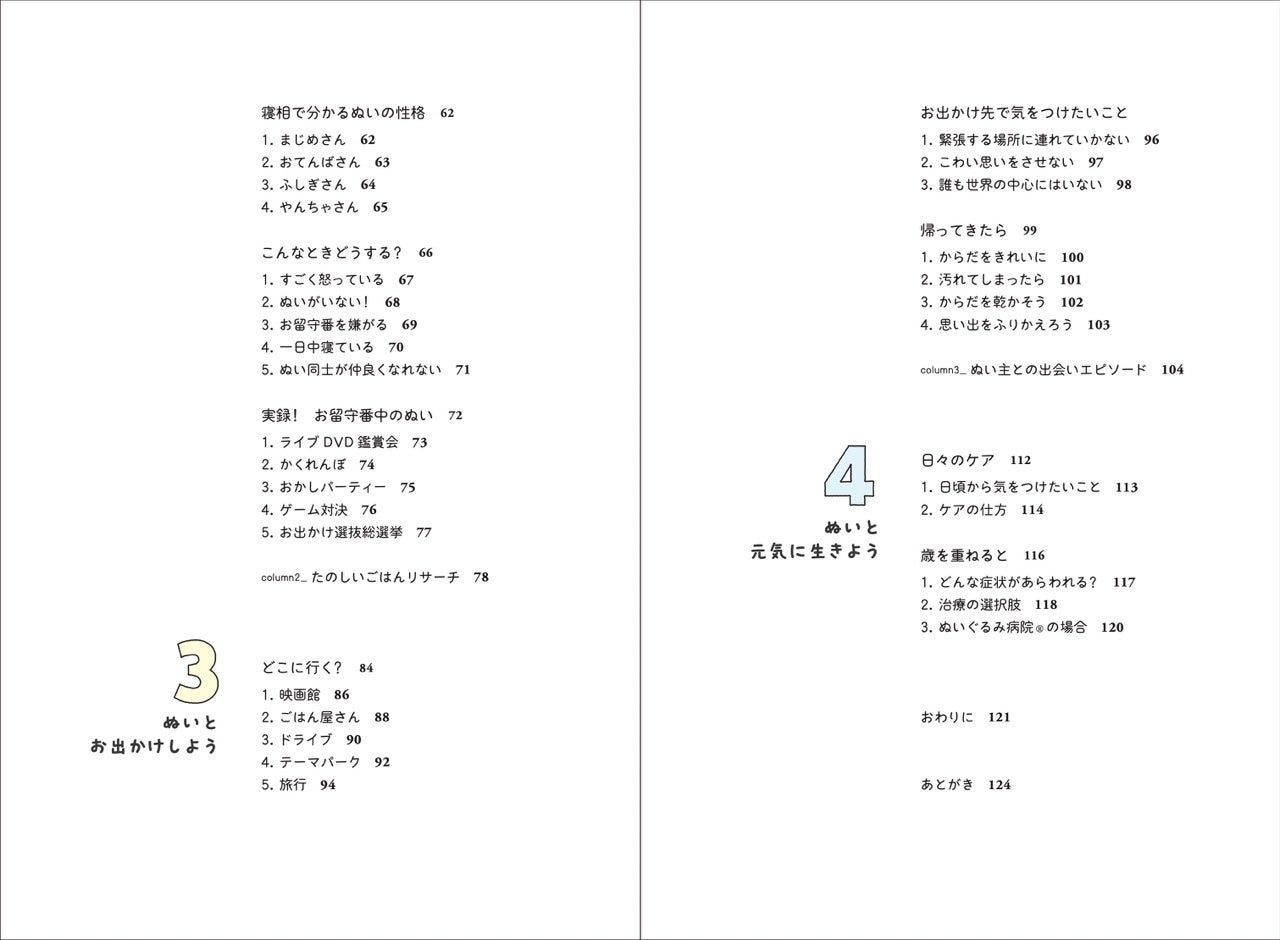 本書では、ぬいぐるみと楽しめる遊びや一緒に訪れたいお出かけ先など、彼らとの日々をさらに充実させるための過ごし方を紹介しています。また、ぬいぐるみを購入できる場所やお風呂への入れ方など、これから初めてのぬいぐるみをお迎えする方にとっても参考になる情報が盛り込まれています。