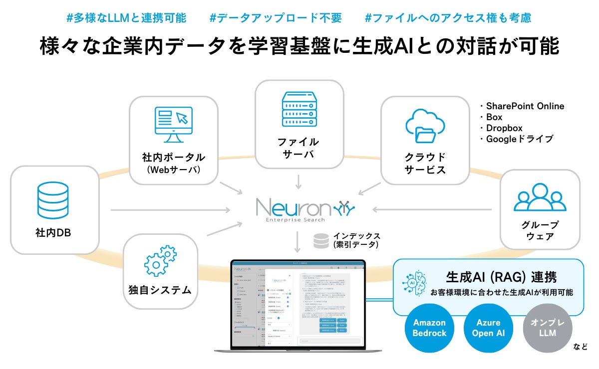 「Neuron ES」は、ファイルサーバやポータルサイトといったオンプレミスで保管されている文書に加え、Microsoft SharePoint、Box、Dropboxといったクラウドストレージをインテリジェント検索できる企業内の検索システムです。生成AI連携オプションを加えることによって、生成AIが文脈を理解しながら情報を抽出・整理でき、さらなる業務効率化や意思決定をサポートします。