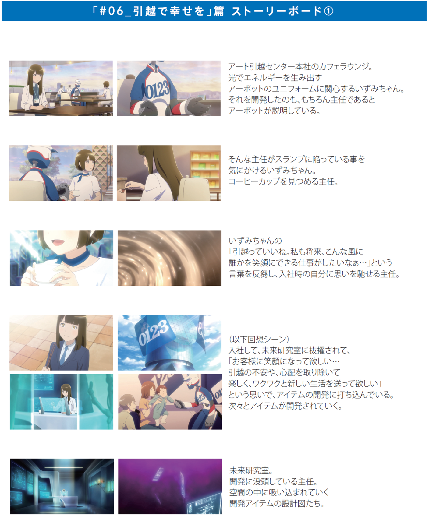 最新話#06 はいずみちゃんの一言がきっかけで、未来の引越アイテムを開発するエースの主任がなぜスランプに なってしまったのかに気付くというストーリーです。主任の開発に対する思いをエモーショナルに描いておりますので、是非ご注目ください。