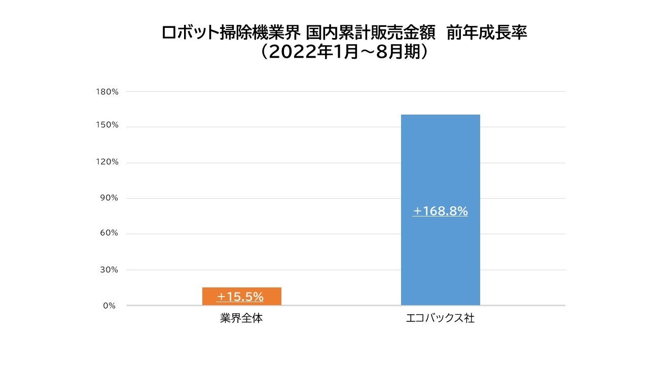 2022年1月~8月期間における、国内ロボット掃除機業界全体の販売金額は前年比+15.4%となりました。販売金額が縮小している企業も多い中、当社は前年比+168.8%と大きく伸長し、成長率No.1を達成いたしました。
