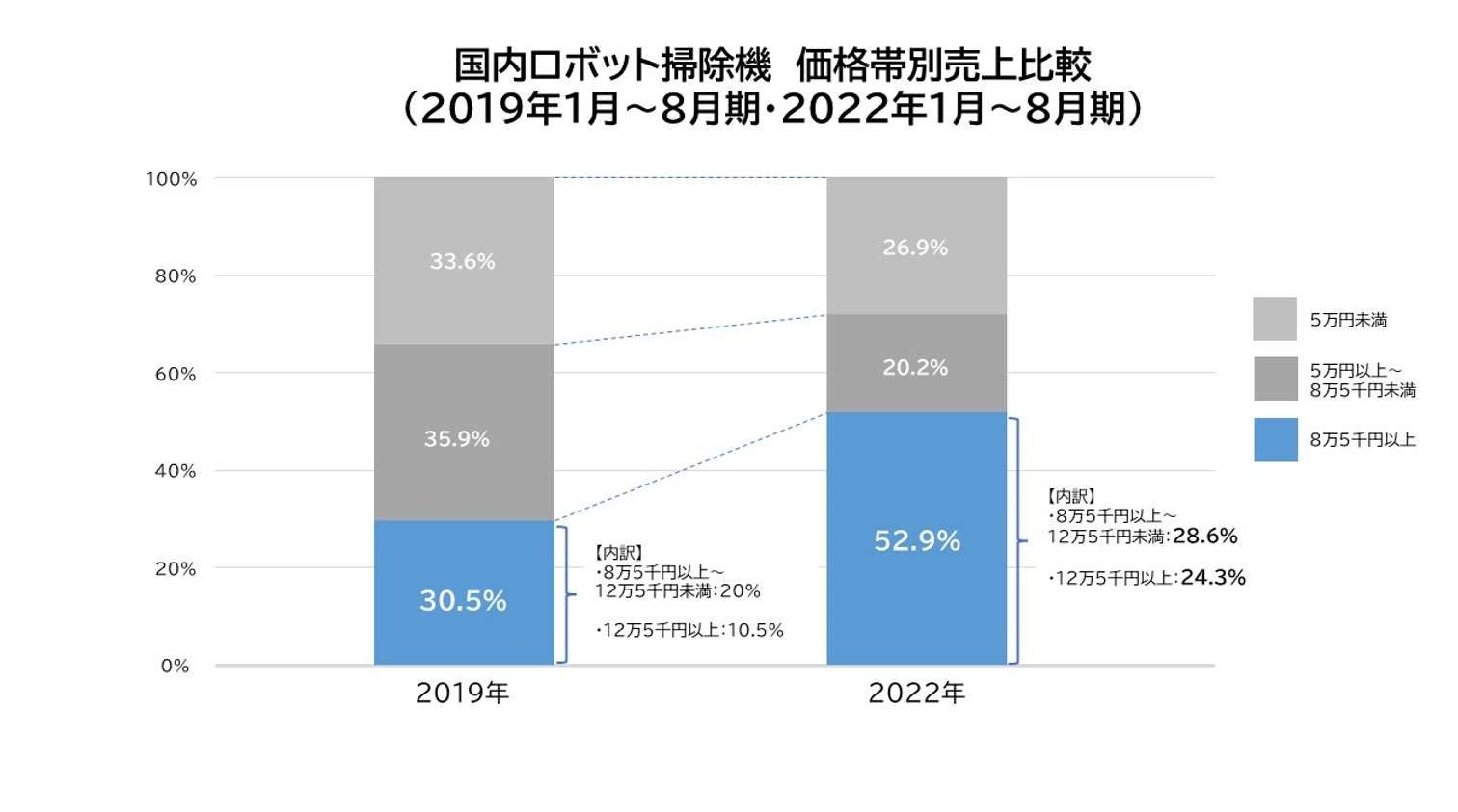 2019年と2022年の価格帯別売上を比較したところ、低価格帯(5万円未満)・中価格帯(5万円以上~8万5千円未満)ロボット掃除機の売上は低下しているのに対し、高価格帯(8万5千円以上)ロボット掃除機の売上は約22%増加し、全体の52.9%の売上を高価格帯ロボット掃除機が占める結果となりました。更に高価格帯ロボット掃除機の中でも、「DEEBOT X1 Family」「DEEBOT T10 Family」が属する12万5千円以上の超高価格ロボット掃除機の売上は、3年で約14%の増加と、急激にシェアを拡大しています。
