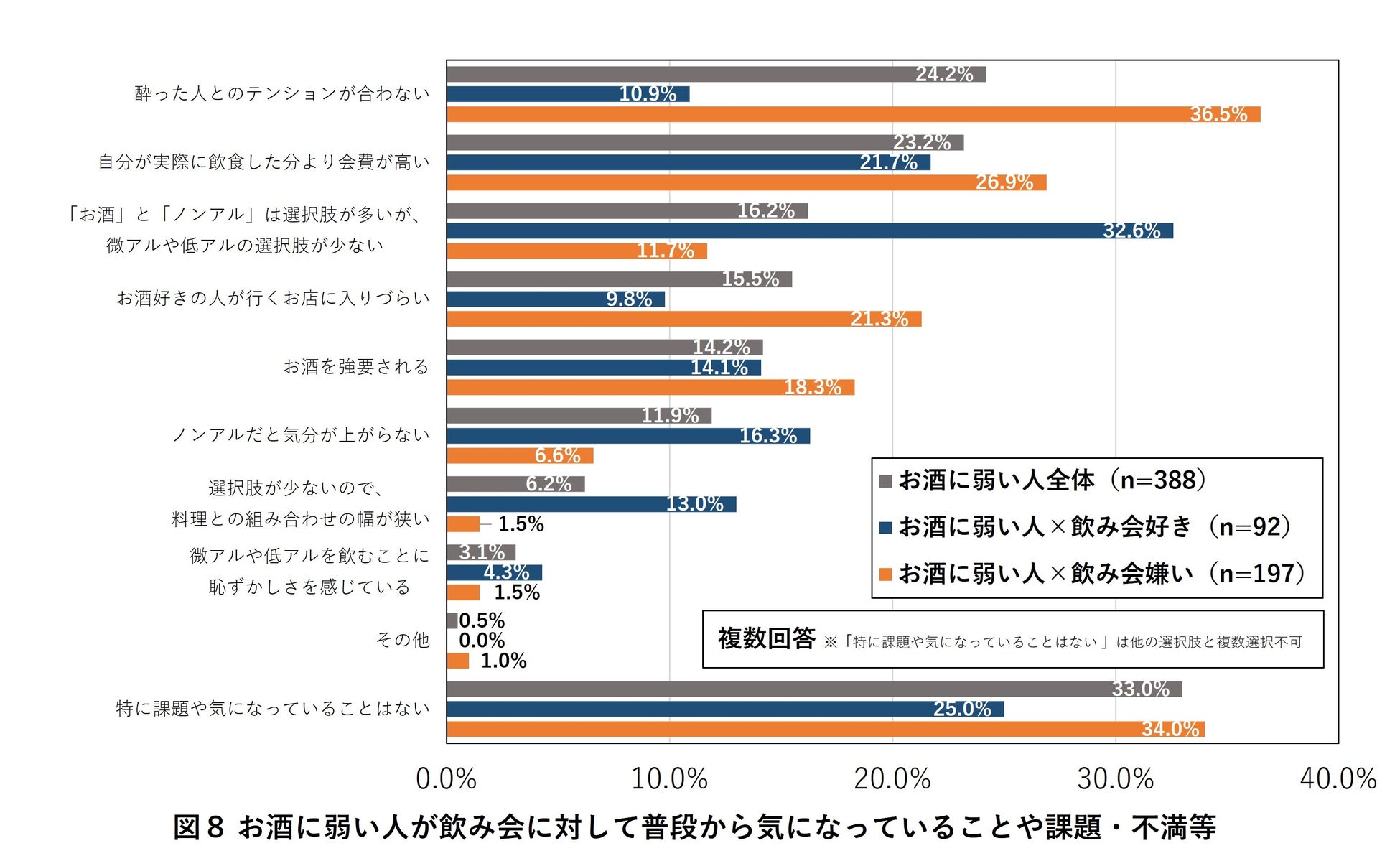 お酒に弱い人たちに、飲み会に感じている課題・不満等を聞いたところ(複数回答)、全体の67.0%が具体的な課題・不満について回答。また、「お酒に弱い飲み会好き」の32.6%が「『お酒』と『ノンアル』は選択肢が多いが、微アルや低アルの選択肢が少ない」、13.0%が「選択肢が少ないので、料理との組み合わせの幅が狭い」、16.3%が「ノンアルだと気分が上がらない」と答え、いずれも全体を上回りました。微アル・低アルビールの選択肢の少なさや、アルコールを飲んだ気分になれないことが飲み会の満足度を下げていることが想定されます。また、「お酒に弱い飲み会嫌い」な人は、「酔った人とのテンションが合わない(36.5%)」、「自分が実際に飲食した分より会費が高い(26.9%)」などが全体を上回り、飲み会にありがちなシチュエーションにマイナスの感情を抱いていることが伺えます(図8)。