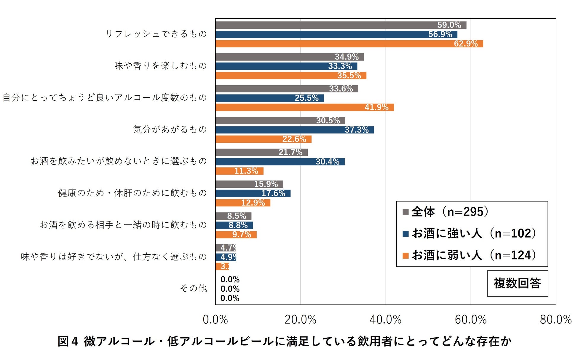 微アル・低アルビールに満足する「お酒に弱い人」は、「リフレッシュ」と「ちょうどいい」。