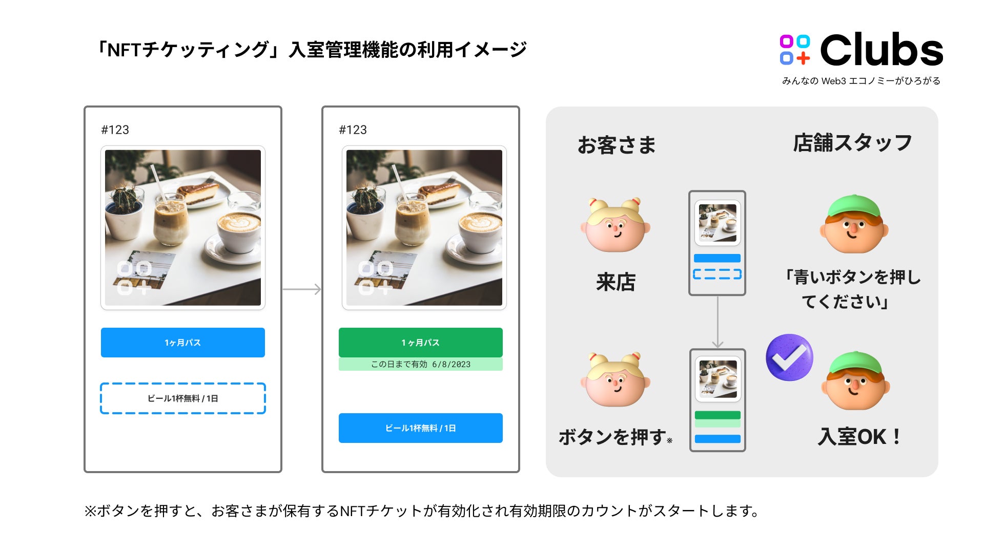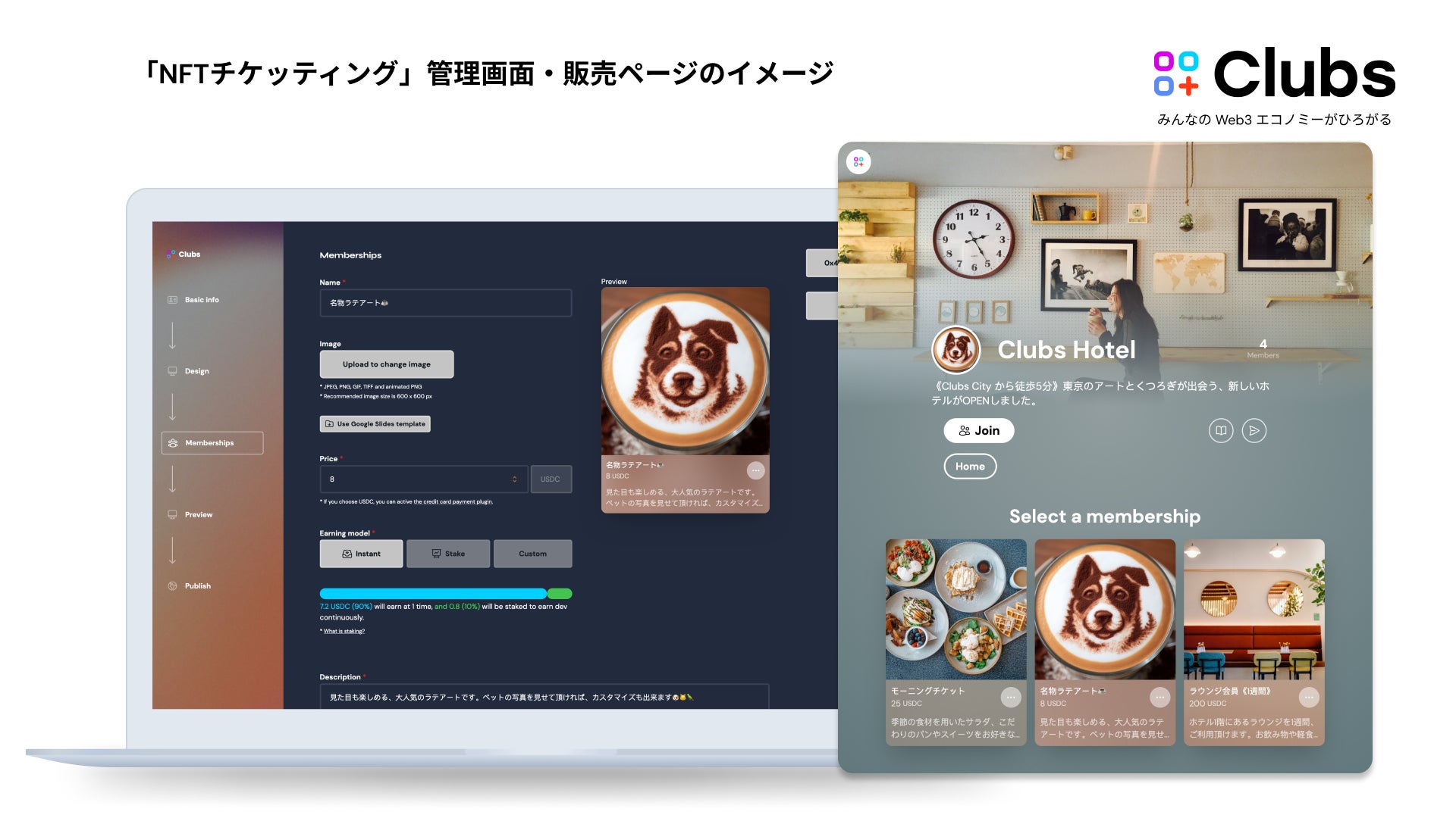 これにより、Clubs 利用者はイベントや催事のチケット、コワーキングスペースの会員権からオンラインLive配信チケットまで、web3の特性を意識することなく、より簡単に販売して、より効率的に管理が可能になります。
