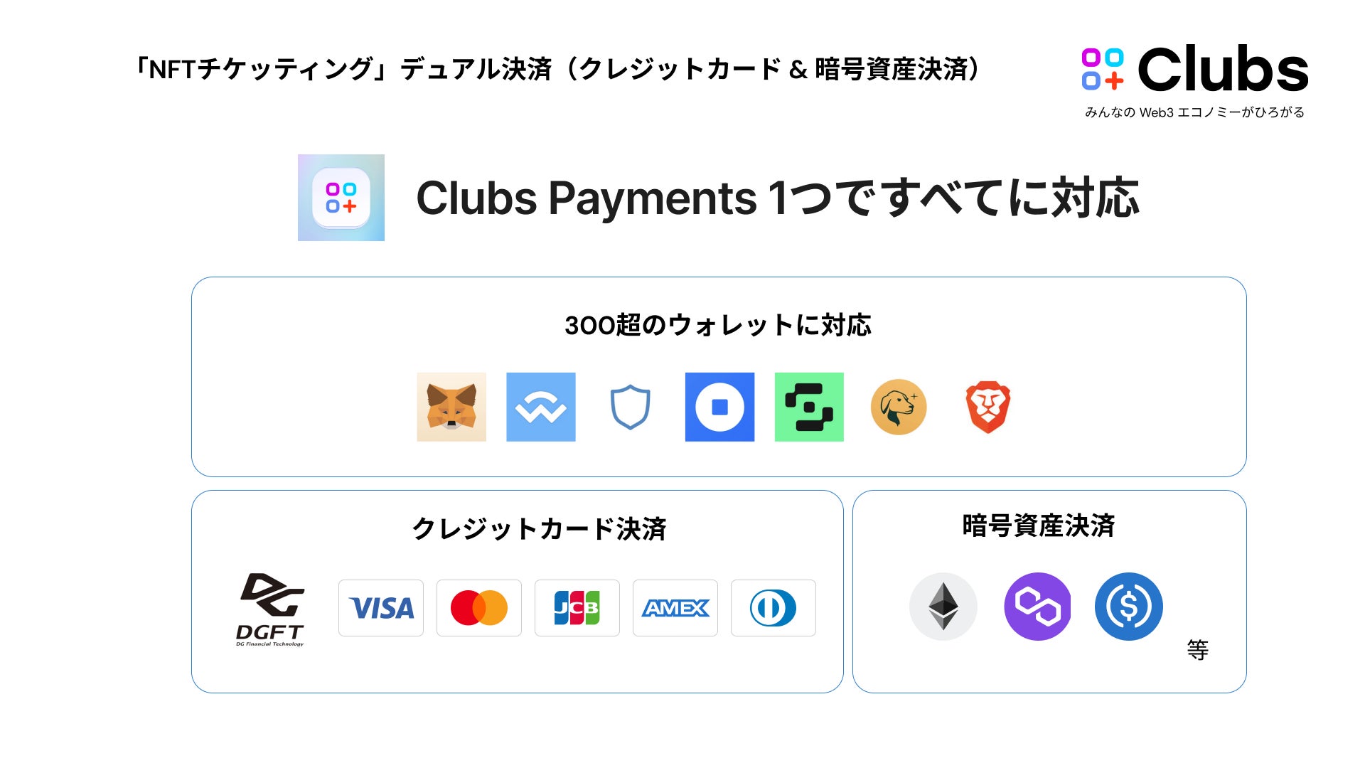 NFTチケッティングには、Clubs Payments が標準搭載され、300超のウォレットに対応し、クレジットカード決済と暗号資産決済の両方を導入可能です。またクレジットカード決済は海外発行カードにも対応しており、インバウンドからオンラインLiveへの限定招待まで、国内外の多くの方へサービスを提供することができます。