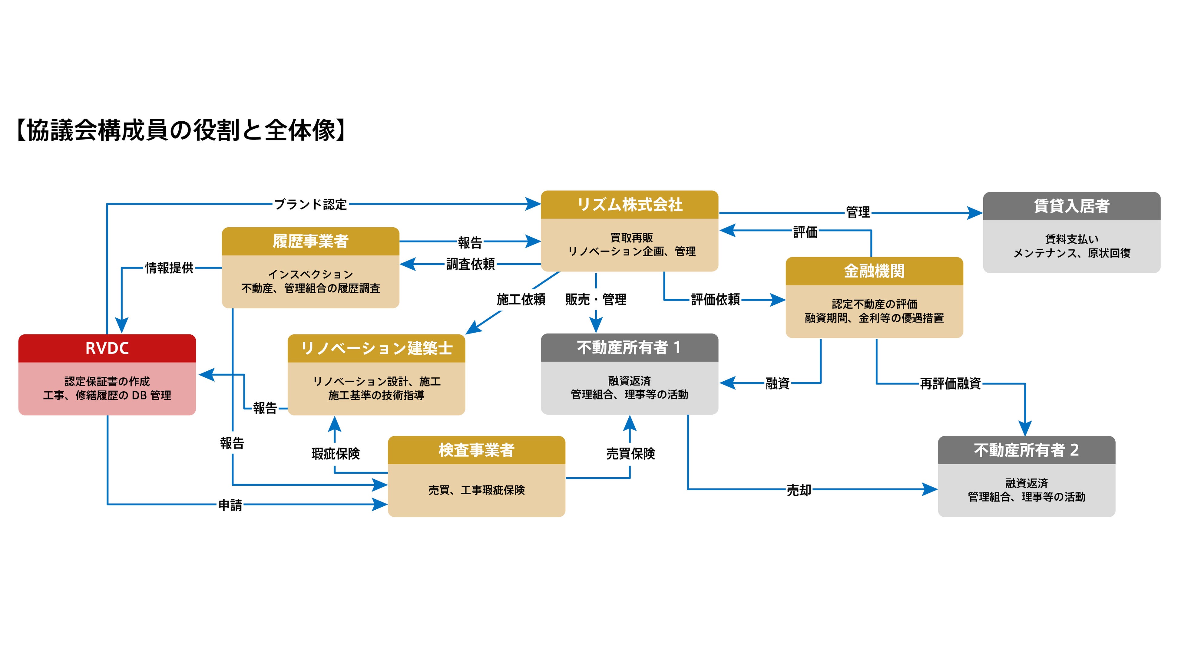 リノベーションバリューデザイン協議会(RVDC)について RVDCは、リズム株式会社(本社:東京都渋谷区、代表取締役:齋藤信勝)を代表提案者として、リノベーション建築士、住宅事業者、検査事業者、履歴事業者等によって構成された団体です。 ・既存住宅におけるリノベーションの技術水準や品質向上 ・既存住宅におけるリノベーションブランドの企画や運営、広報活動 ・既存住宅におけるインスペクションによる状況調査や改善指導 ・既存住宅における評価基準の制定や関係団体および消費者の利益の保護 ・その他当法人の目的を達成するために必要な事業 上記を活動目的として、収益不動産に向けた新たな適正基準を促進し、価値が逓減せず、継続的に価値が持続する仕組みを作ります。 webサイト:https://rvdc.or.jp/ |