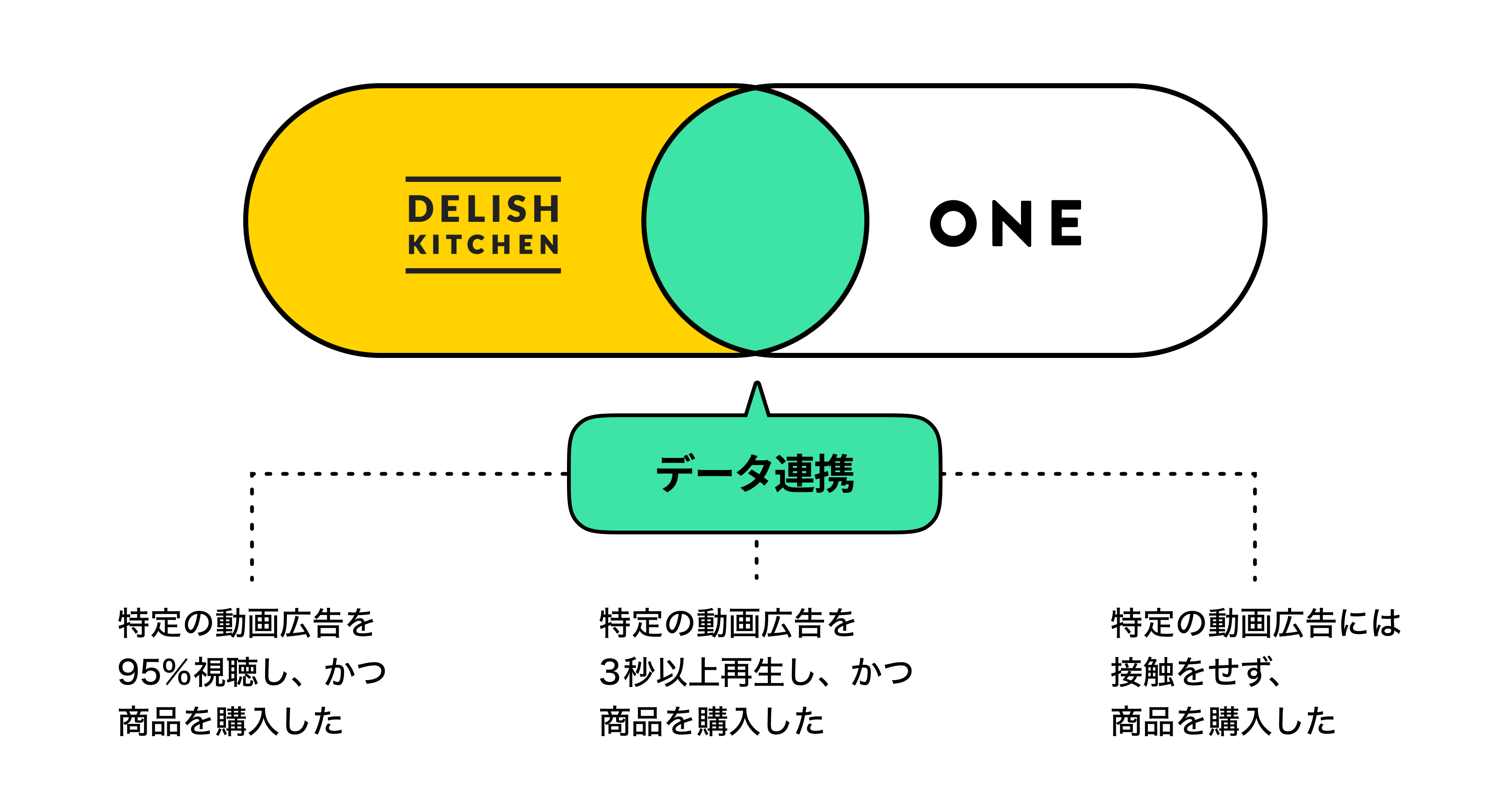 本提携により、オンラインとオフラインの垣根を超えマーケティングの精緻化を可能にする「レシピ動画広告のオフライン購買検証サービス」を提供してまいります。『DELISH KITCHEN』のユーザーデータと『ONE』の購買データを統合・分析することで、特定の動画広告の視聴度合いと購買状況を継続的に可視化できます。