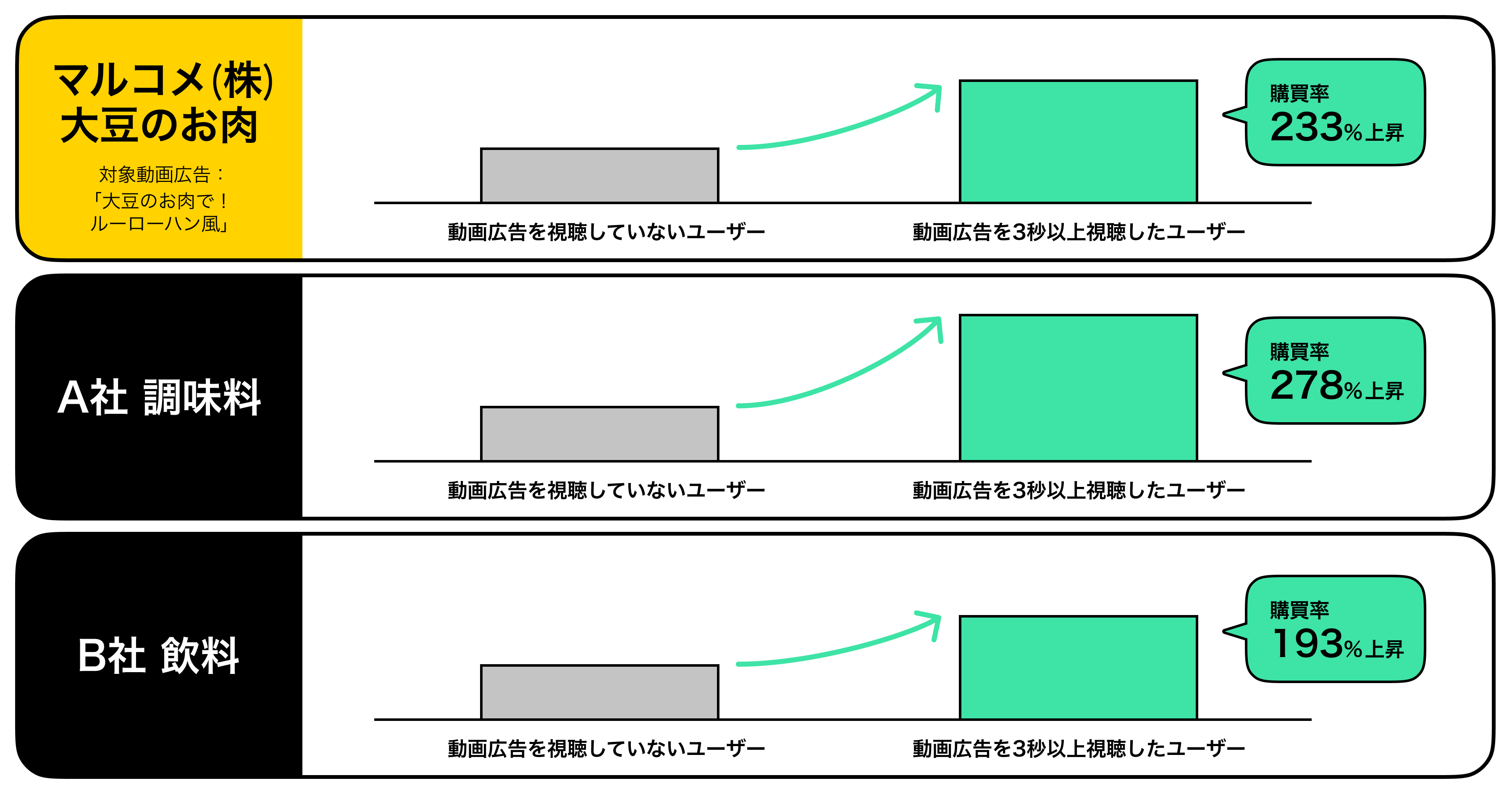 マルコメ(株)をはじめ、『DELISH KITCHEN』 とのタイアップレシピ動画広告と同期間のレシートデータを照合しました。結果、動画広告を3秒以上視聴したユーザーは、動画広告を視聴していないユーザーと比較すると約2倍以上高い購買率となることがわかりました。
