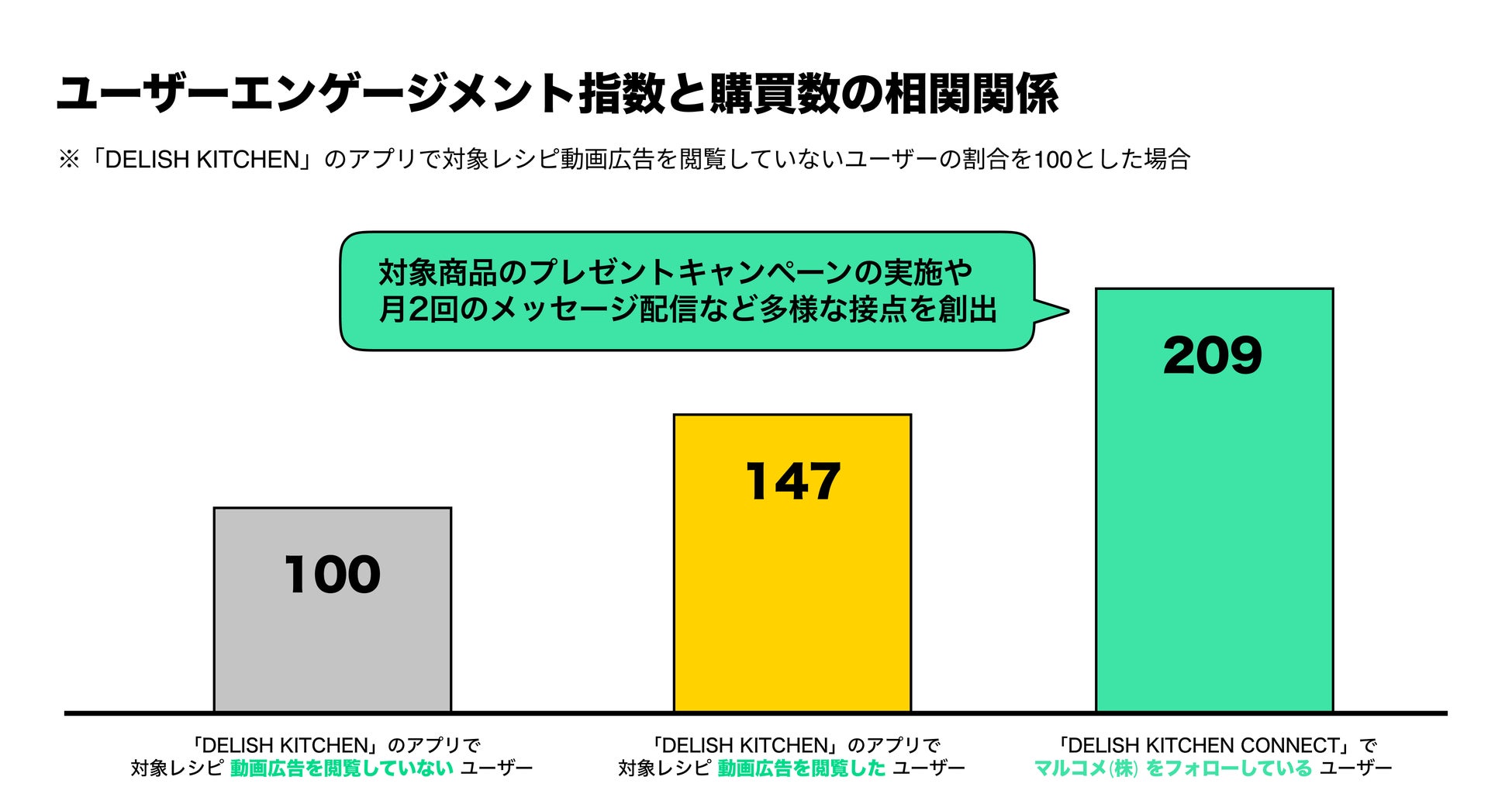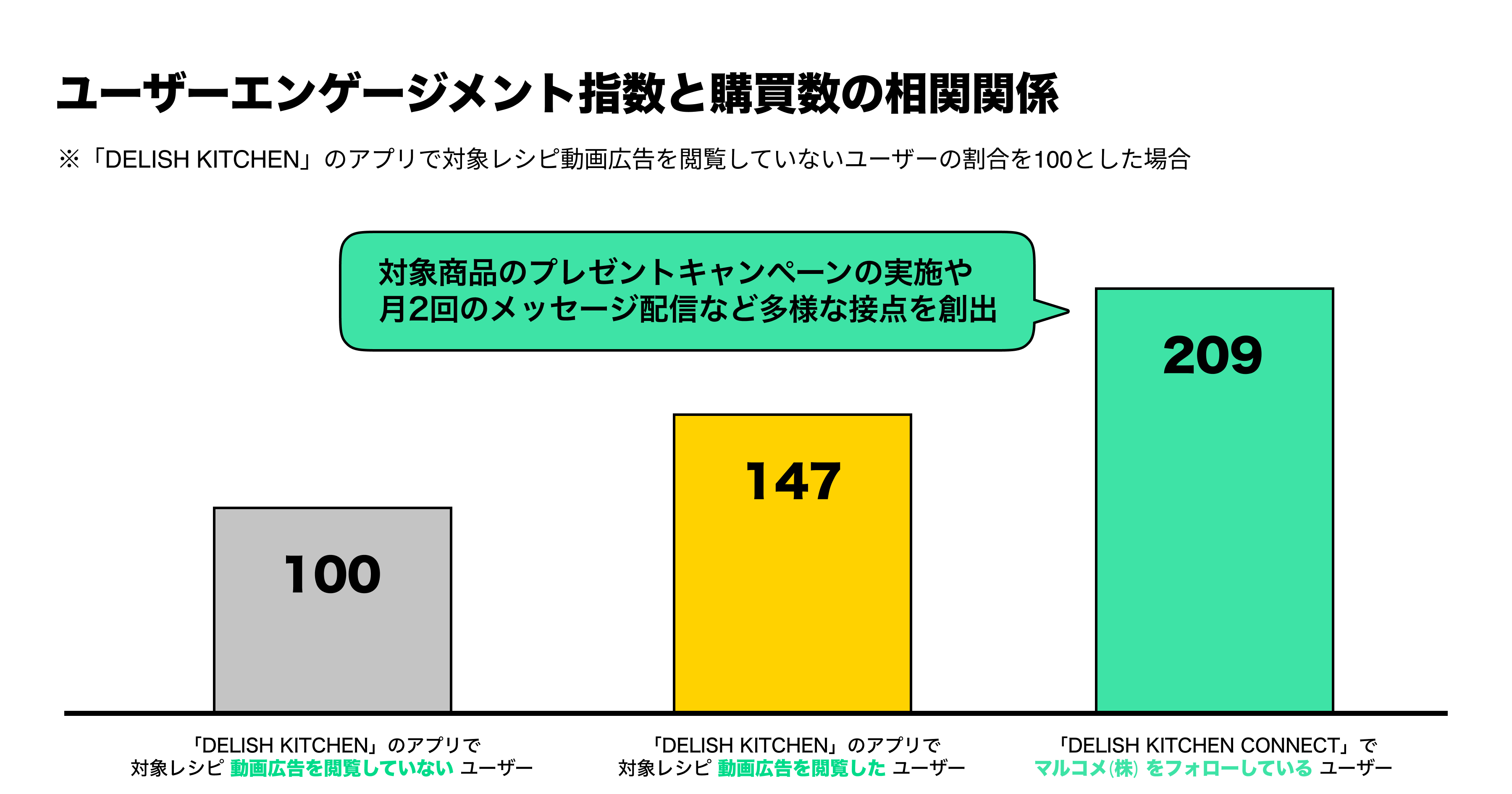 ユーザーのエンゲージメント指数ごとに購買数の推移を検証しました。マルコメ(株)の事例では、『DELISH KITCHEN』のアプリ内でマルコメ(株)の公式アカウントをフォローしているユーザーの購買率は、アカウントをフォローしていない/動画広告の閲覧もしていないユーザーの購買率に比べて2倍以上も高い数値となりました。